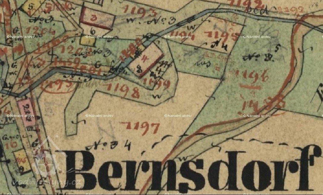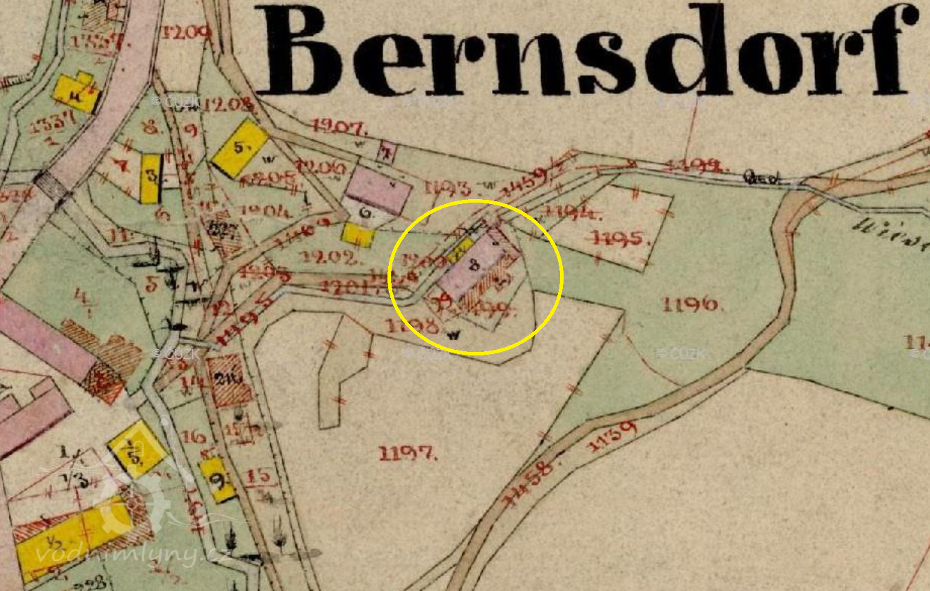 Tento mlýn (před stavbou Rauchova mlýna - Rauchmühle) byl v Bernarticích u Trutnova jediným mlýnem a sloužil k mletí obilí. V Urbarium des Guetts Schatzler, renouiret vndt vermehret (Anno 1647), v překladu Urbář statku Žacléř, obnoven a doplněn (z roku 1647) je uvedeno, že na žacléřském panství bylo tehdy pět mlýnů, z nich měl mlýn v Bernarticích 2 kola a mlel (nejspíš ročně) 60 strychů obilí. Uvedený urbář byl převzat do knihy: PRÄTORIUS, Karl, WEBER, Hellmut, Schatzlar - eine sudetendeutsche Stadt im böhmischen Riesengebirge und die Bezirksgemeinden, Marburg/Lahn 1993. (Ing. Günter Fiedler)