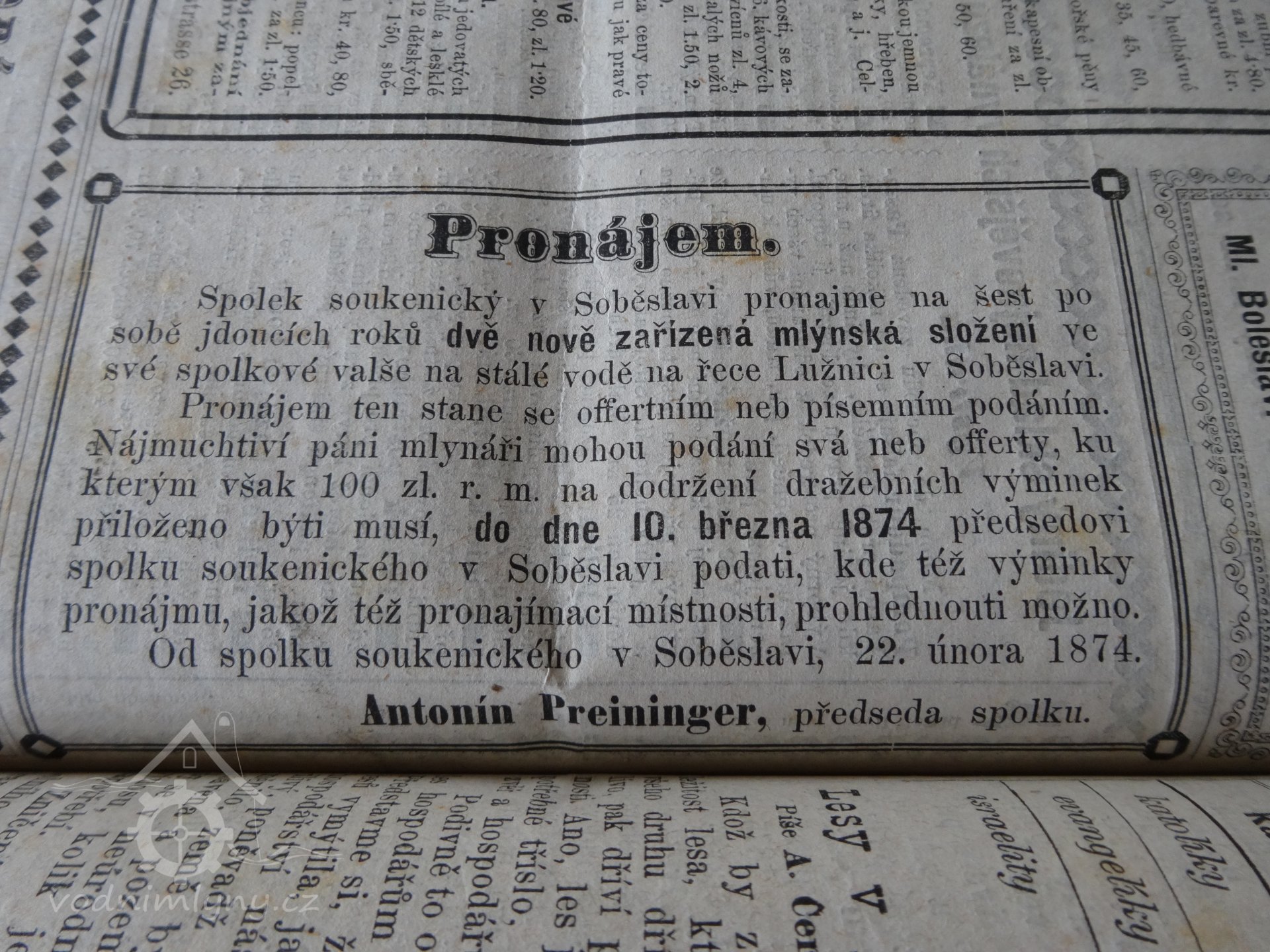 Výnosem c.k.místodržitelství v král. Českém ze dne 9.1.1907 č.258790 bylo při mlýnu tomto uděleno povolení ku postavení turbíny systému Francisova s řízenou spotřebou vody 2056 l/s, k rozšíření žlabu mlýnského z 1,165 m na 3,2 m. Míra užívání vody pro turbínu je omezena vzhledem k vodním právům mlýna čp.1 na pravém břehu Lužnice v Soběslavi...