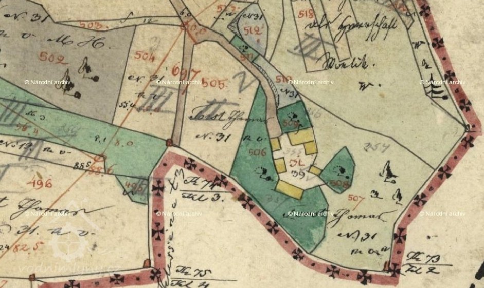 Protože k bývalému mlýnu patřilo málo pozemků (v urbáři z roku 1618 a dalších je uvedeno „Ze mlejna Hrušovskýho osedlý bez potahu jeden”), Mikuláš Hadáček přikoupil v roce 1638 od sedláka Jana Šejdy z Kovářova kus pozemku na „pahrbku u Hruškovského rybníka”. Podle urbářů platili držitelé samoty Budař z tohoto rybníka od roku 1642 ročně 30 grošů míšeňských. Tento velký rybník, který již zanikl, ale dodnes z něho zůstala zachována mohutná hráz v sousedství usedlosti, patřil zřejmě k bývalému mlýnu. Z něj byla voda přiváděna dřevěným korytem (vantroky) na mlýnské kolo. Rybník byl ještě zakreslen na mapě I. vojenského mapování z let 1764–1768. Mapa stabilního katastru z roku 1830 však již rybník nezobrazuje. Přesto na mapě II. vojenského mapování z let 1836–1852 je samota Budař stále označena symbolem mlýna.