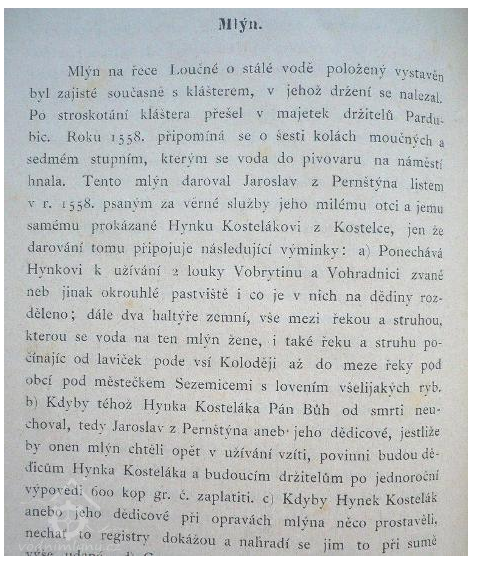 1558 mlýn o 6 kolech moučných a 1 stupním daroval Jaroslav z Pernštejna Hynkovi Kostelákovi z Kostelce, kdyby si ho chtěl on nebo jeho dědicové od dědiců Hynkových zpět vzíti, musí jim po jednoroční výpovědi zaplatit 600 kop grošů českých. (viz příloha)