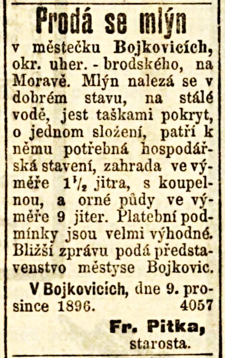 V březnu 1902 mlýn vyhořel, škoda činila 16.000 K. (RR)