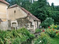Od malého jezu s přepadem dlouhým náhonem, z boku mlýna do prostoru lednice, zde do malé kašny přes turbinu, dále odtokem zpět do potoka...