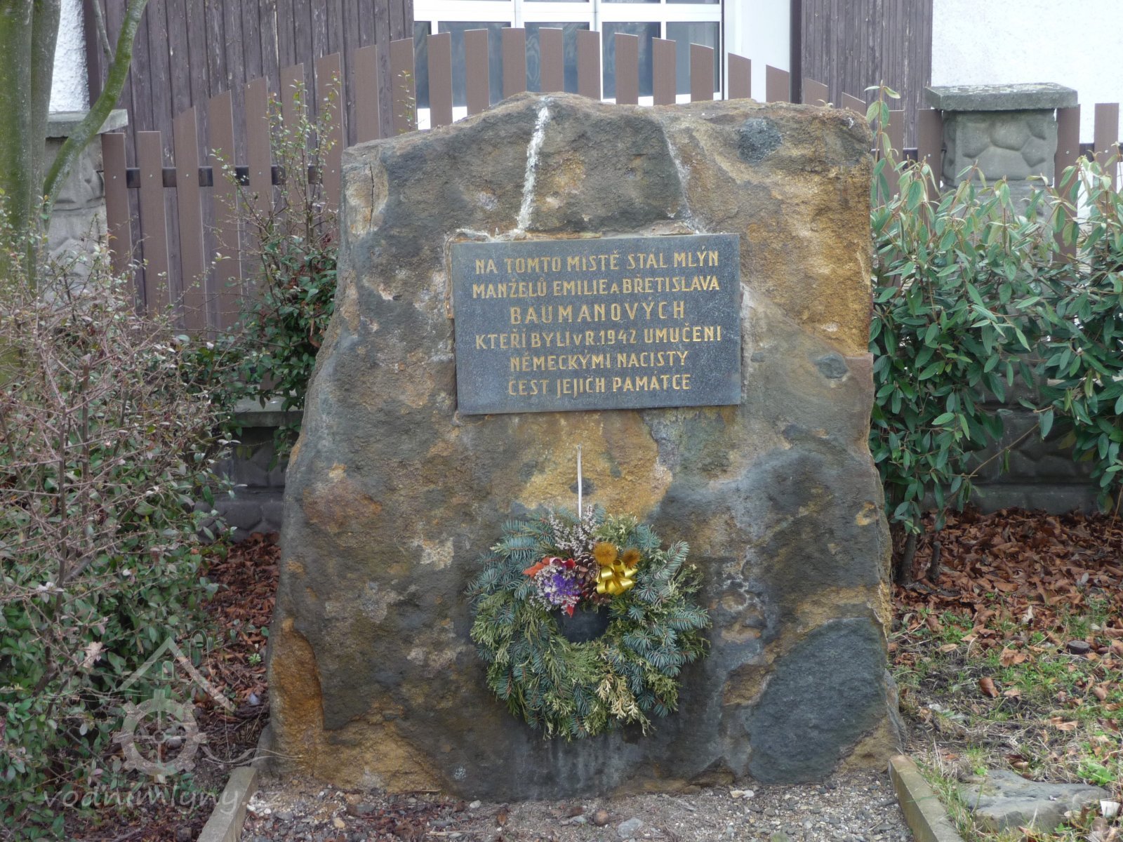 V roce 1942 (24.10.1942) byli popraveni majitelé mlýna Emílie a Břetislav Baumanovi německými nacisty za pomoc parašutistům skupin Anthropid Jozefu Gabčíkovi a Janu Kubišovi, kteří se po seskoku u nedalekých Nehvizd v prosinci 1941 ukrývali v bývalých lomech v okolí. Na nároží bývalého mlýna je postaven pomník manželům Baumanovým. Více viz.