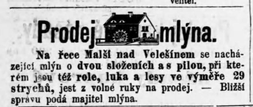 Malše, Velešín 121 (čp. je v Seznamu uvedeno chybně), Jan Pučegl (zde uvedeno příjmení správně !), mlýn-pila-elektrárna, 1 turbína Francis, průtok 2,5 m3/s, spád 4,5m, výkon vodního motoru 120 k. s.