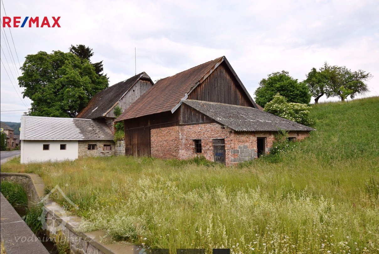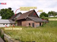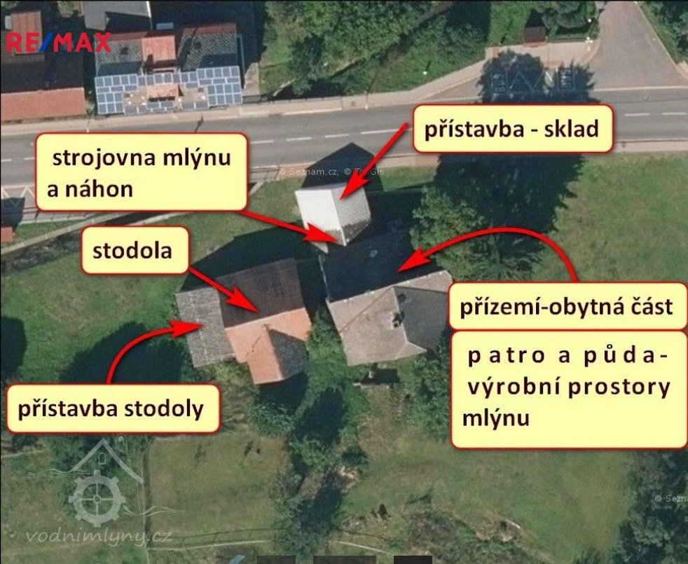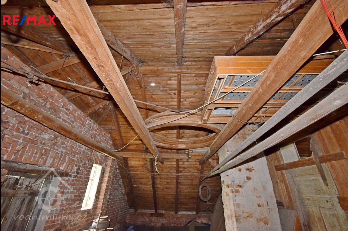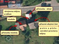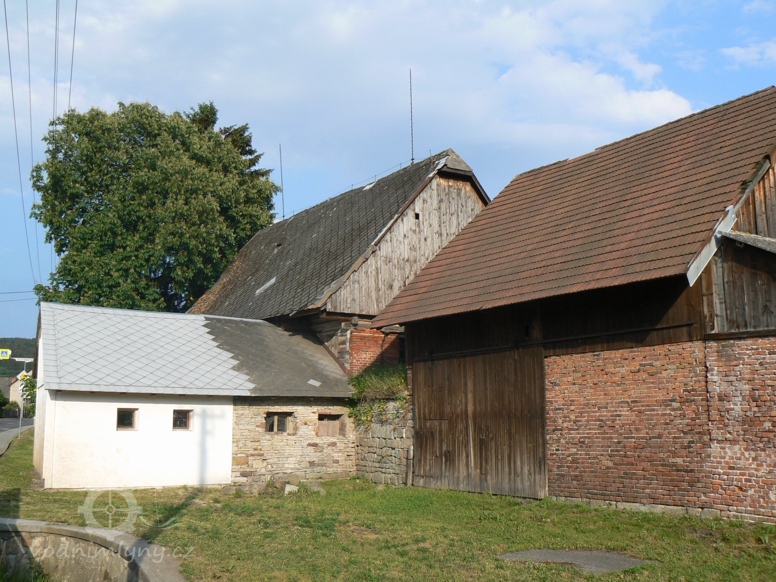 Patrový mlýn se zděným přístavkem z r. 1938, stodola 1539, na křížovém půdoryse.