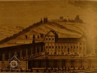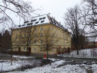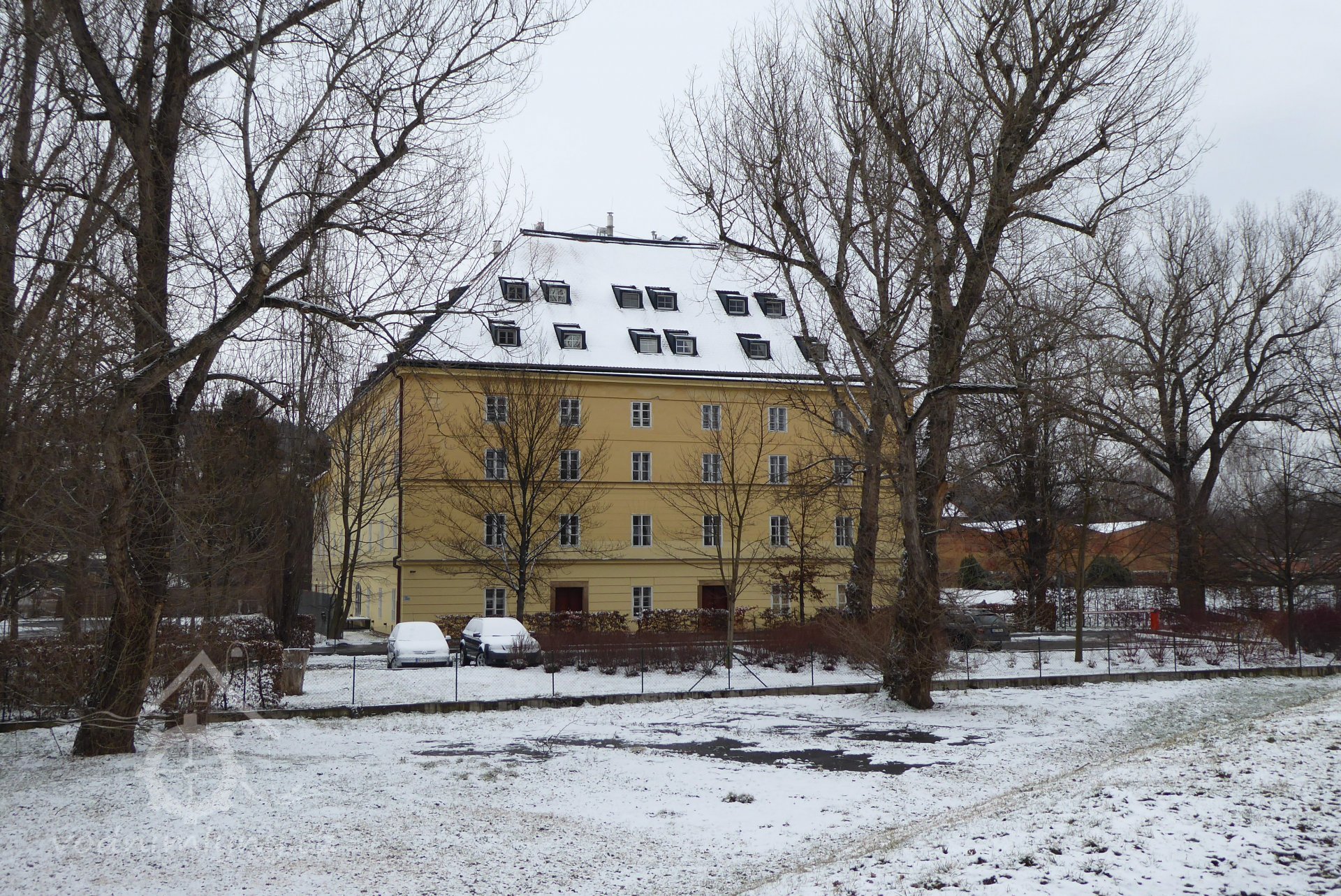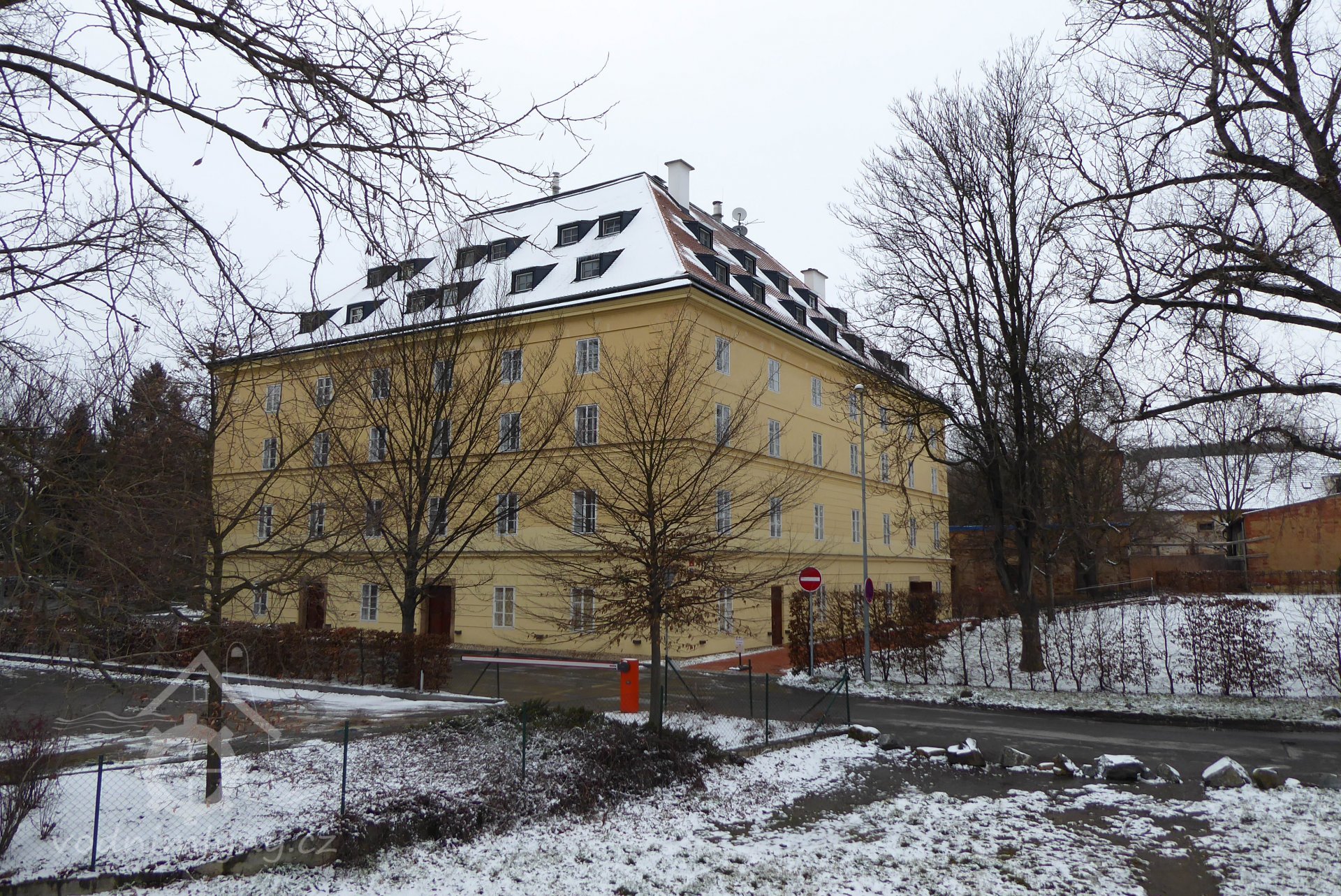 Mohutná čtyřpodlažní budova s připojenými stájemi na S, jihozápadně od zámku a pivovaru.