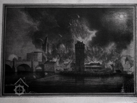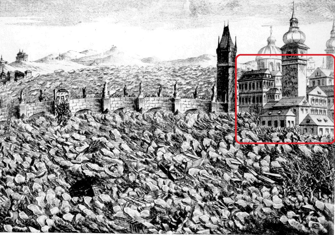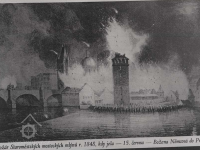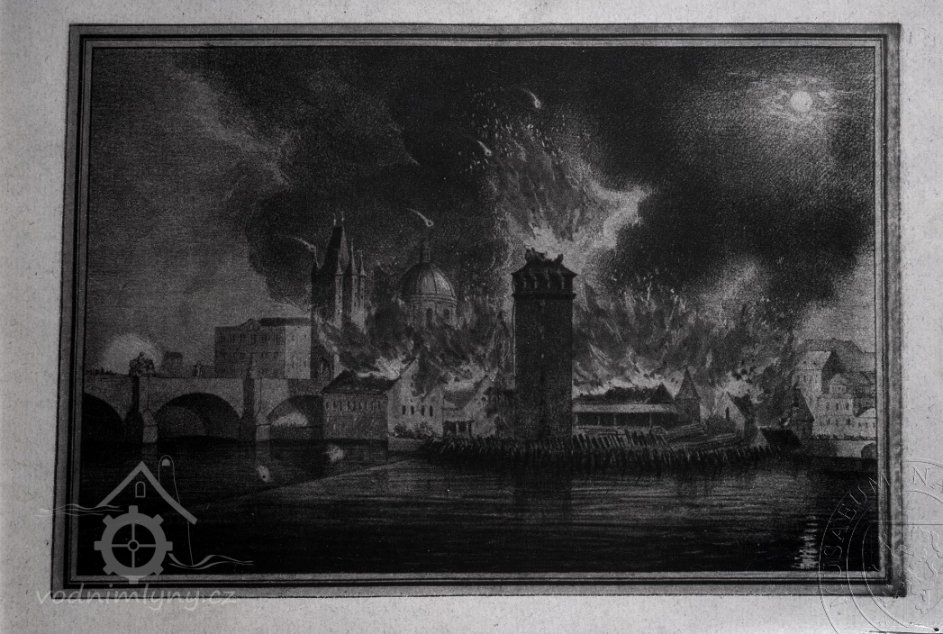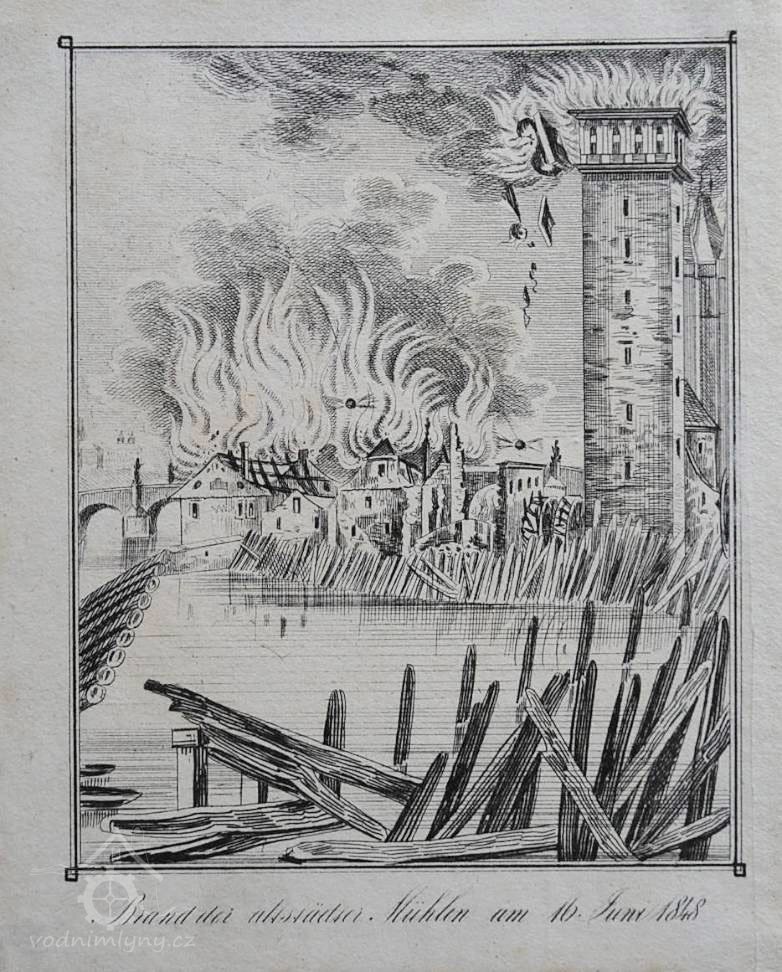 16. 6. 1848 byly mlýny zapáleny dělostřeleckou palbou z Letné na rozkaz generála Windischgraetze. Oheň se rychle rozšířil na celý soubor budov, kvůli neustávající dělostřelbě se nedalo hasit. Na pomoc přispěchali tiskaři a typografové z Haasova závodu na Anenském náměstí, kterří rozebrali lešení na sousedních domech, čímž zabránili dalšímu šíření ohně, naštěstí bylo bezvětří. Mlýny a vodárenská věž však vyhořely do základů.
