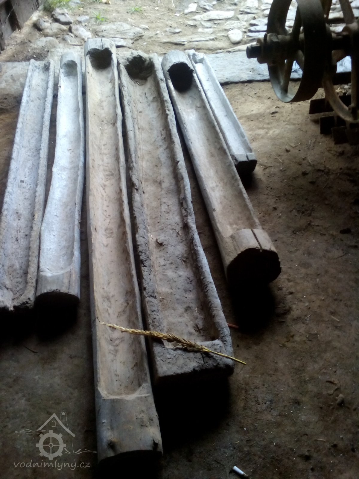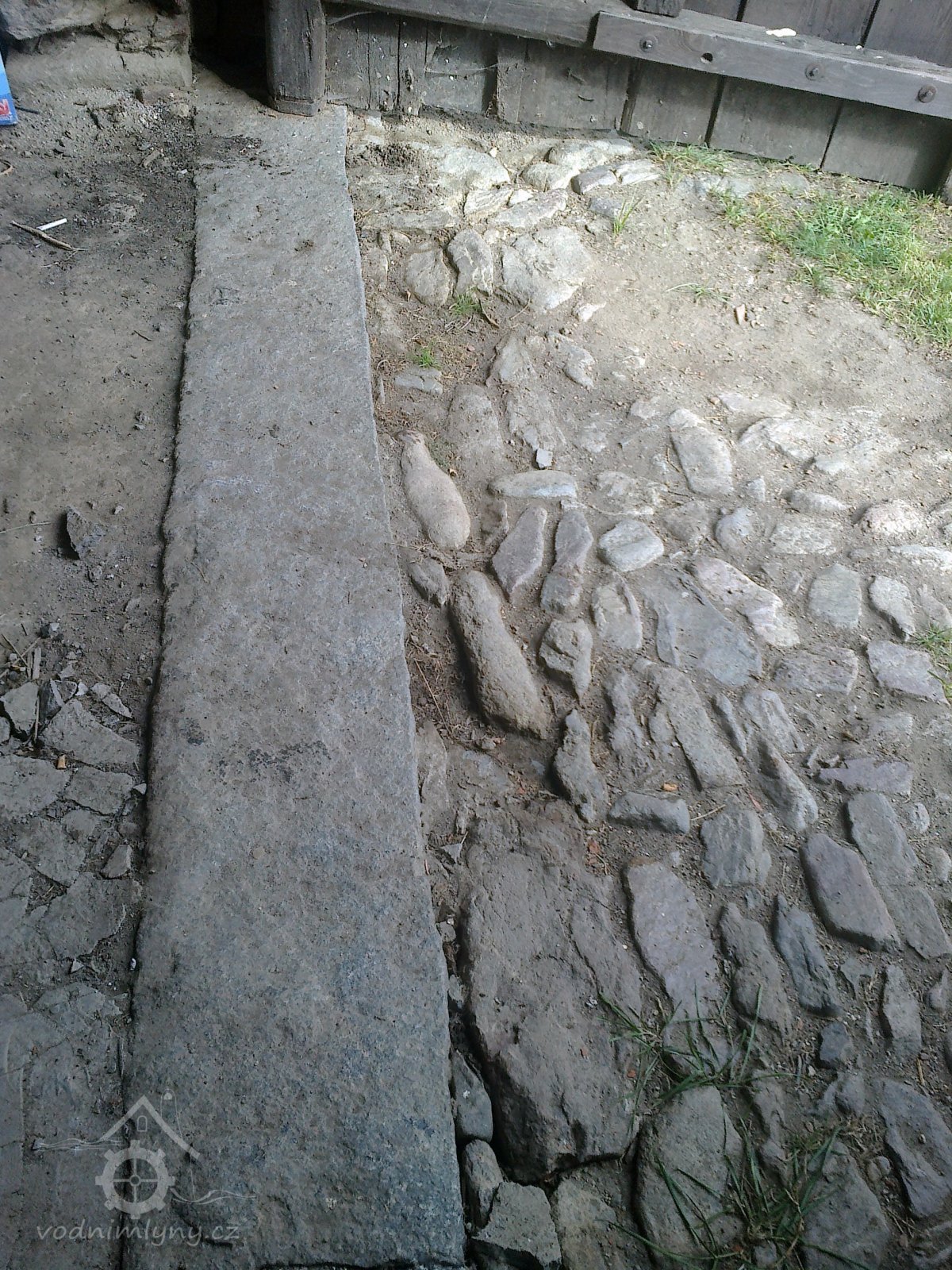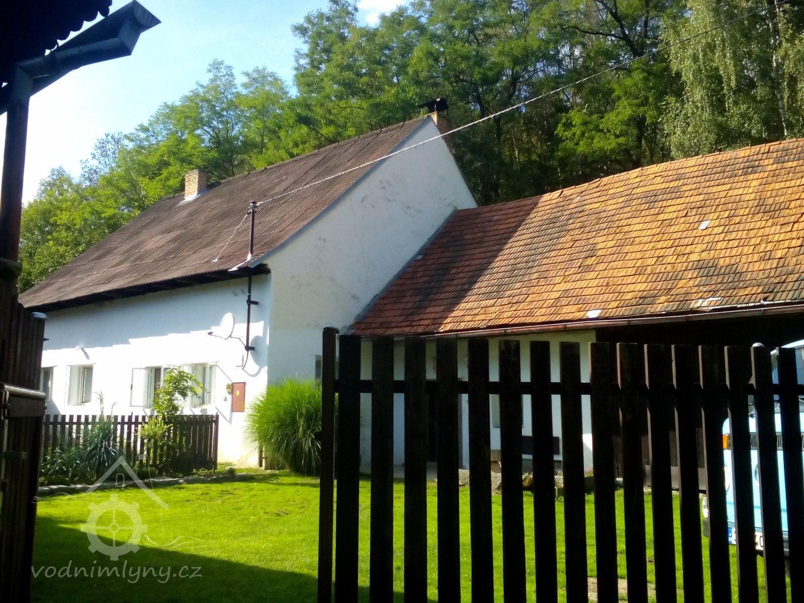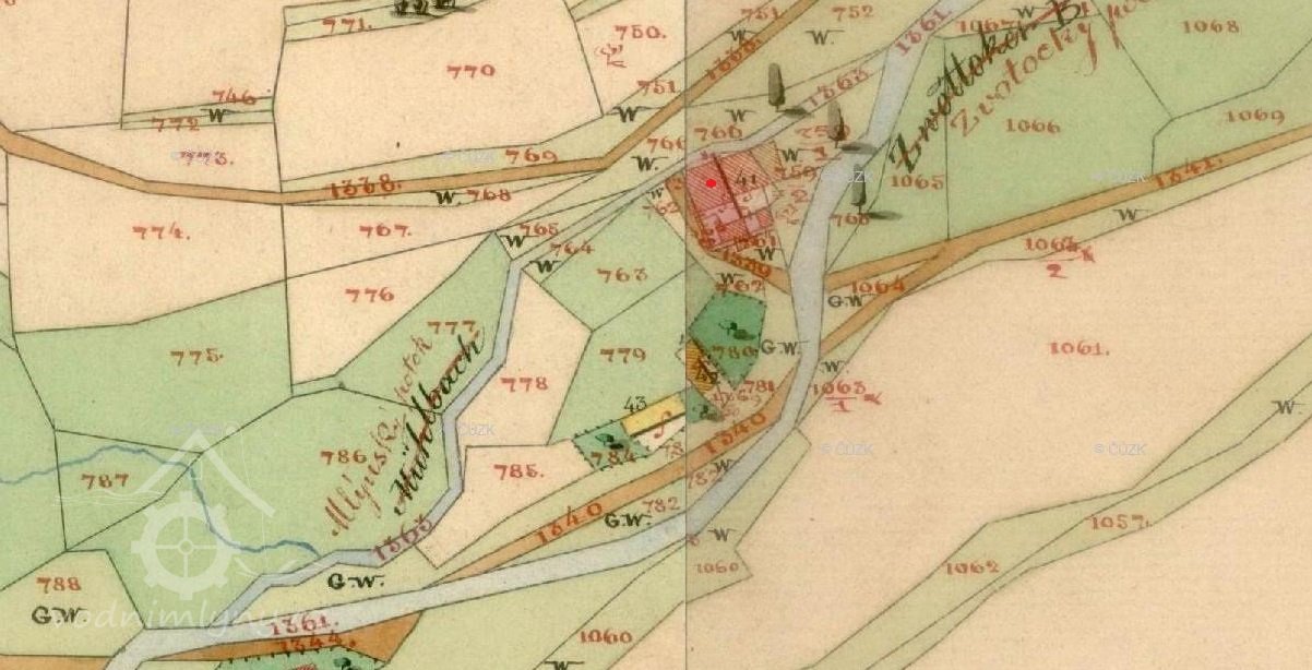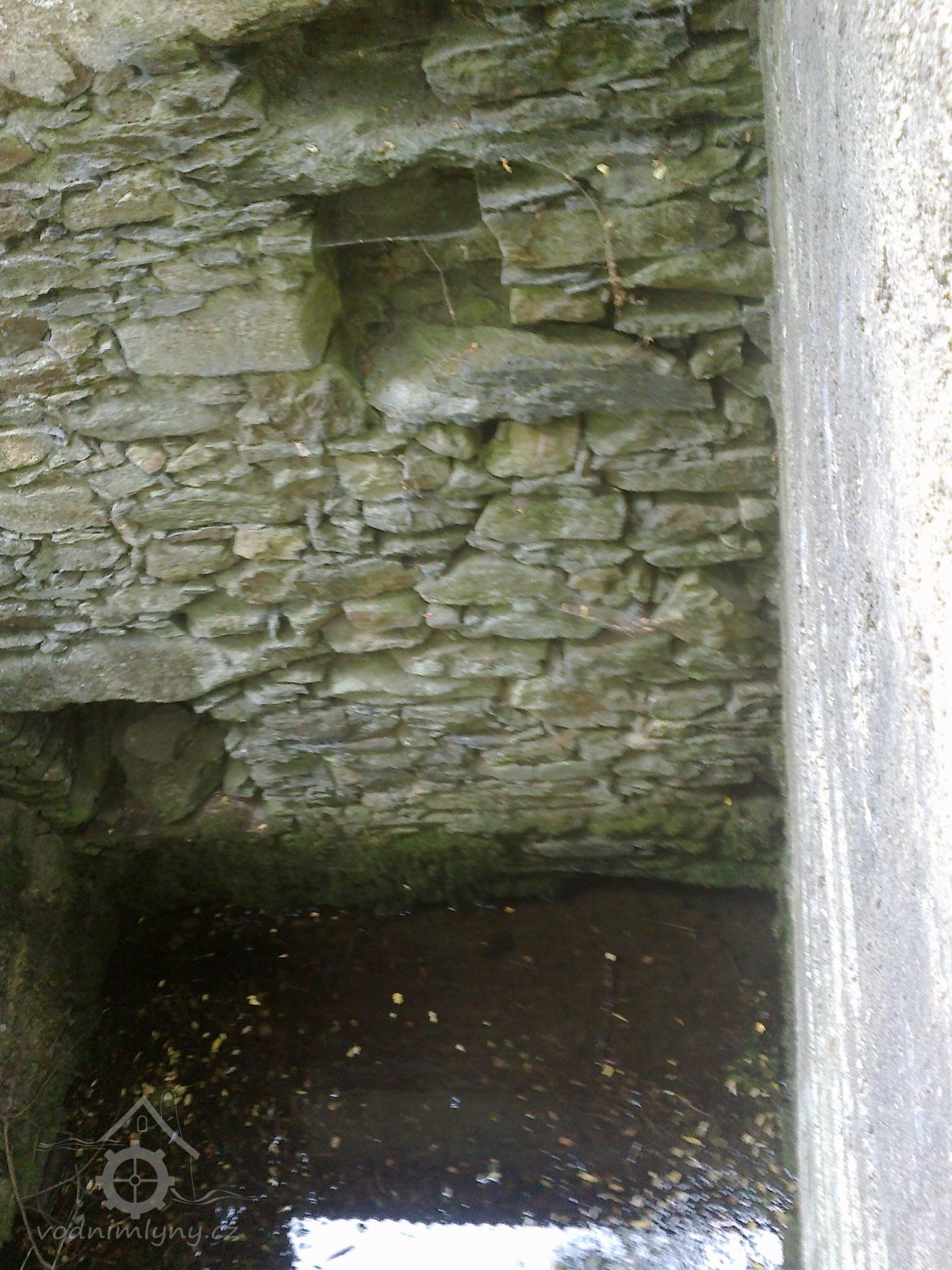 Voda z potoka zdýmá se pevným 210m dlouhým jezem do náhonu, který při svém odbočení z potoka opatřen jest vpouštěcím stavidlem o šířce 0,82m. V mlýnských vantrokách 1,15m širokých dvě stavidla. Pravé: 0,45m široké a 0,33m vysoké. Levé 0,47m široké a 0,33m vysoké.