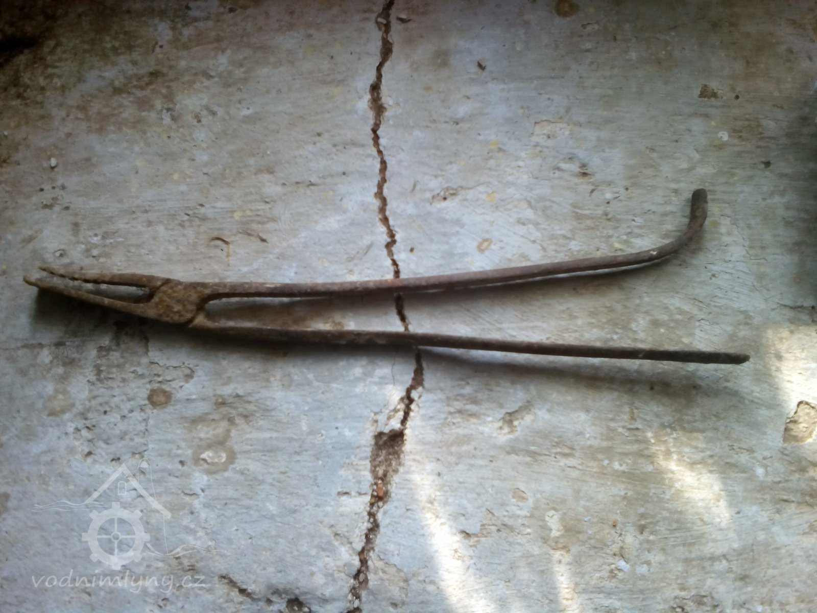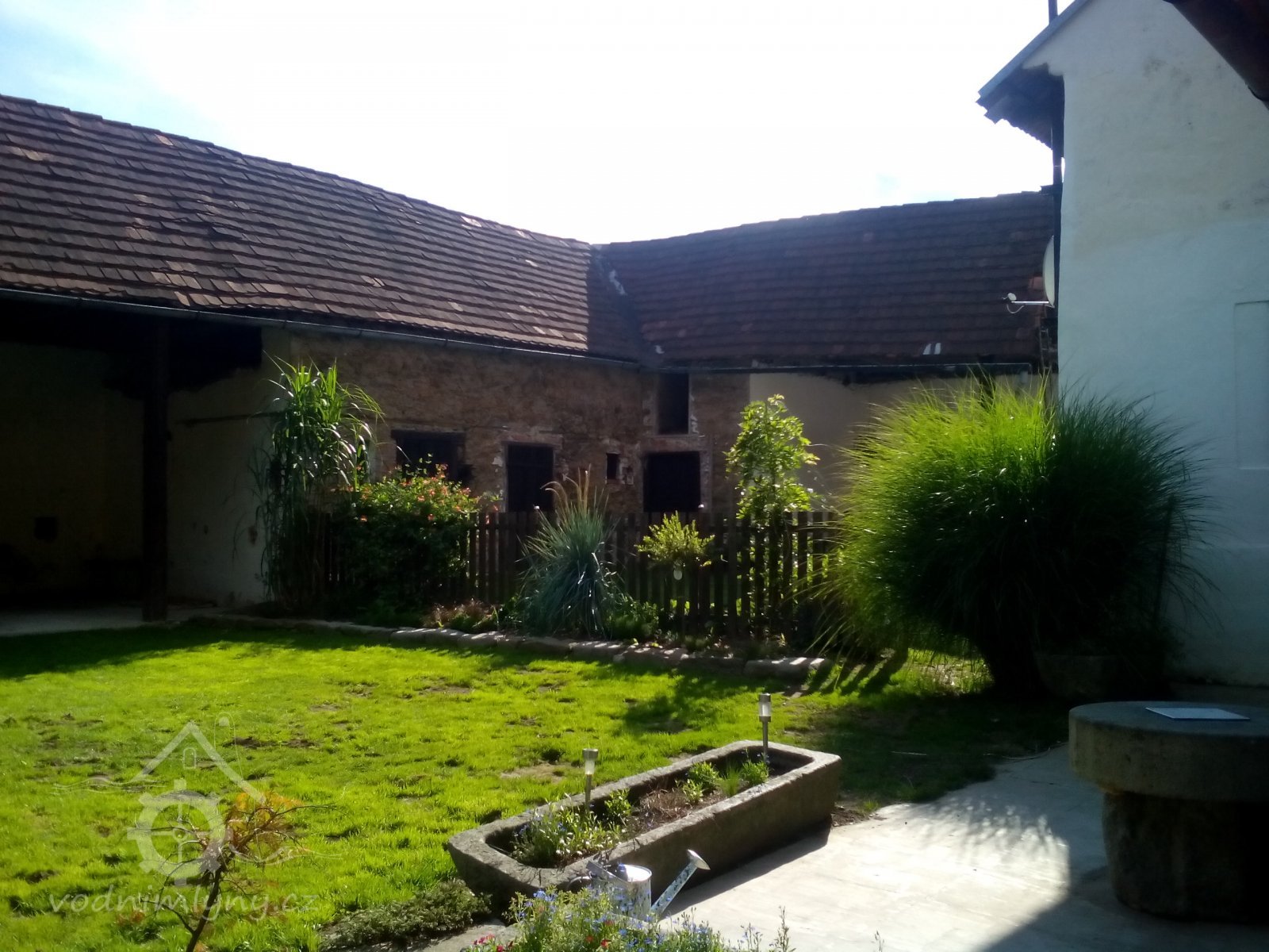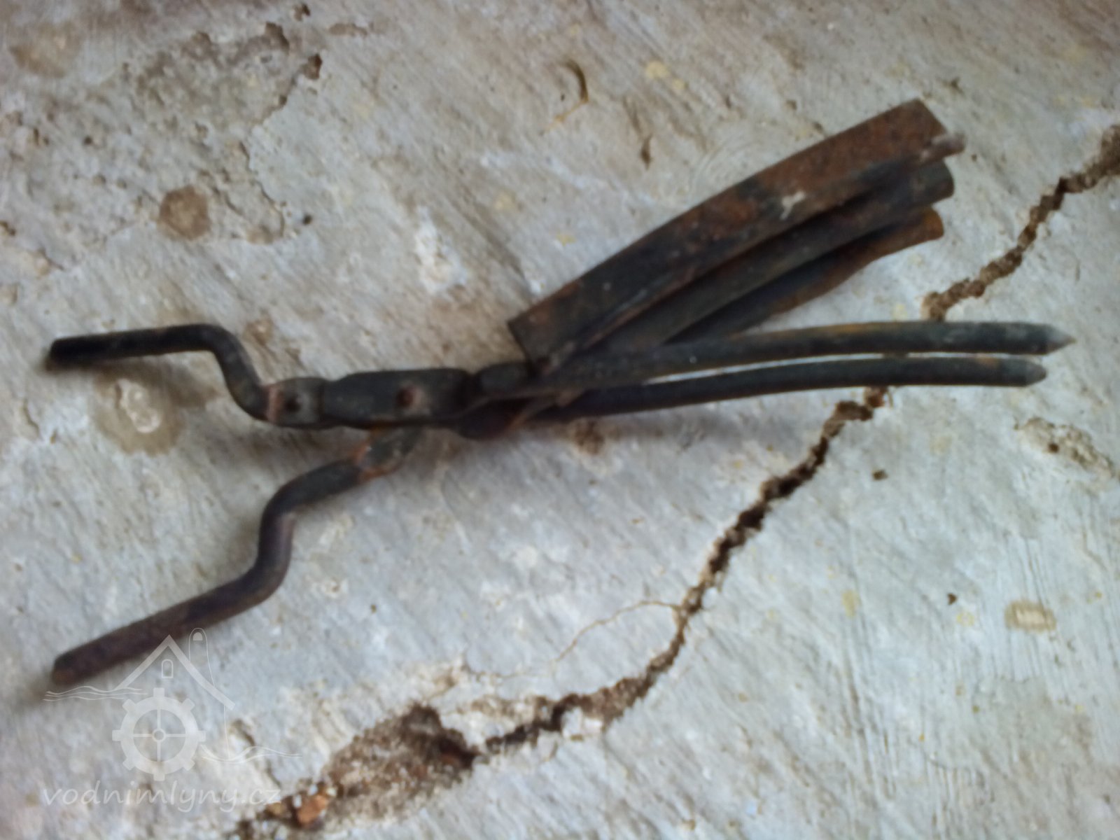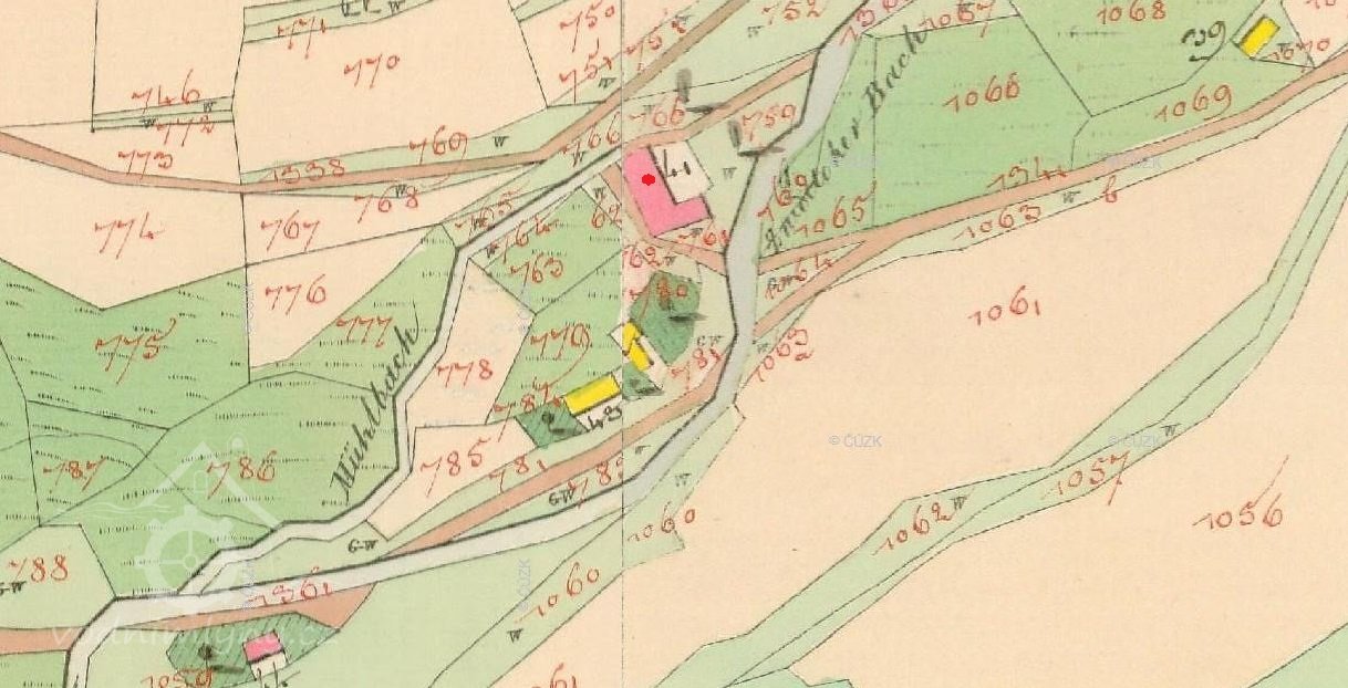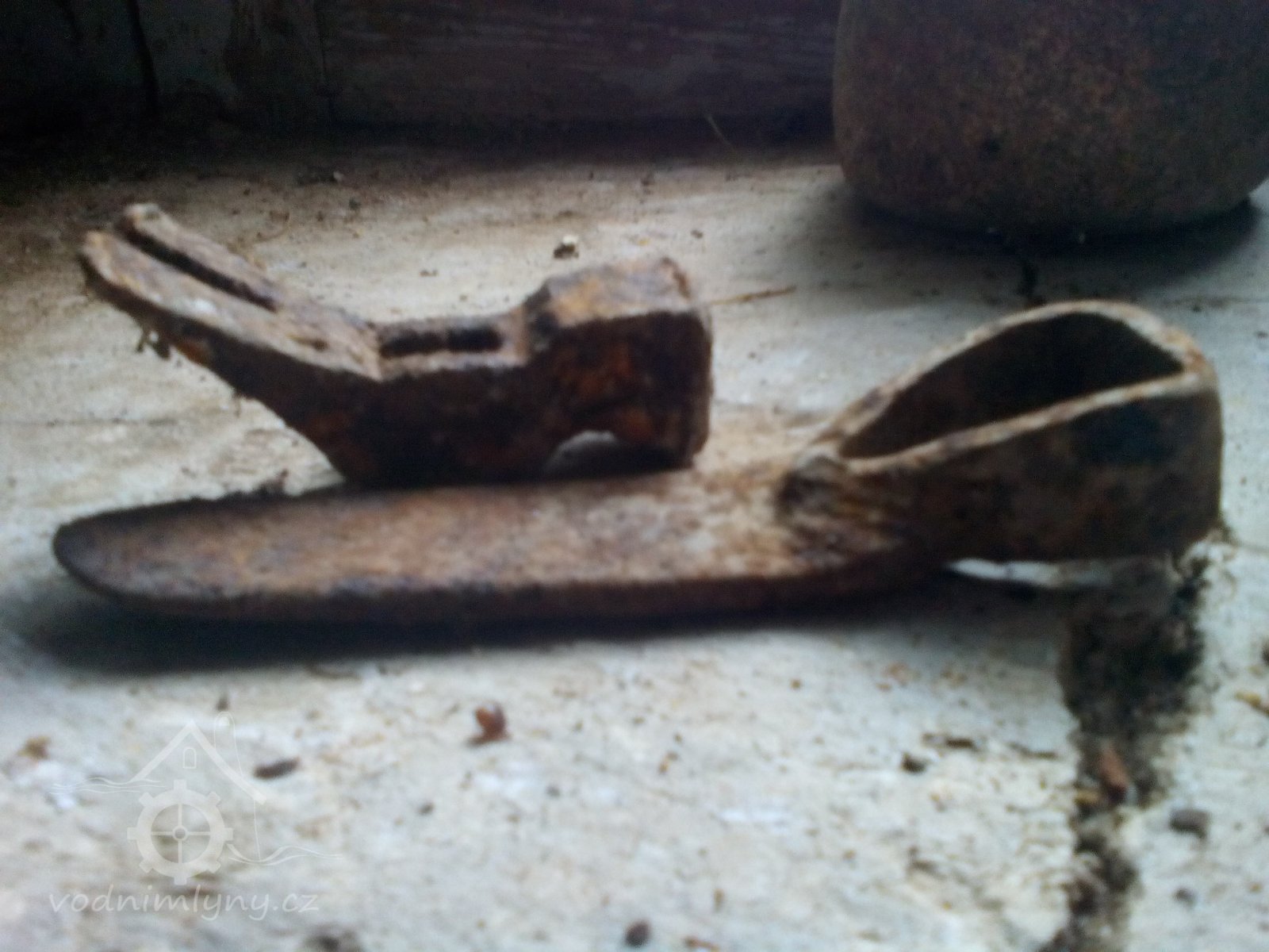 Voda z potoka zdýmá se pevným 210m dlouhým jezem do náhonu, který při svém odbočení z potoka opatřen jest vpouštěcím stavidlem o šířce 0,82m. V mlýnských vantrokách 1,15m širokých dvě stavidla. Pravé: 0,45m široké a 0,33m vysoké. Levé 0,47m široké a 0,33m vysoké.