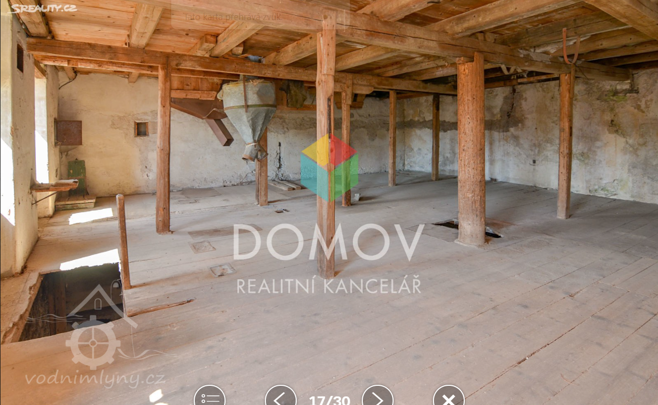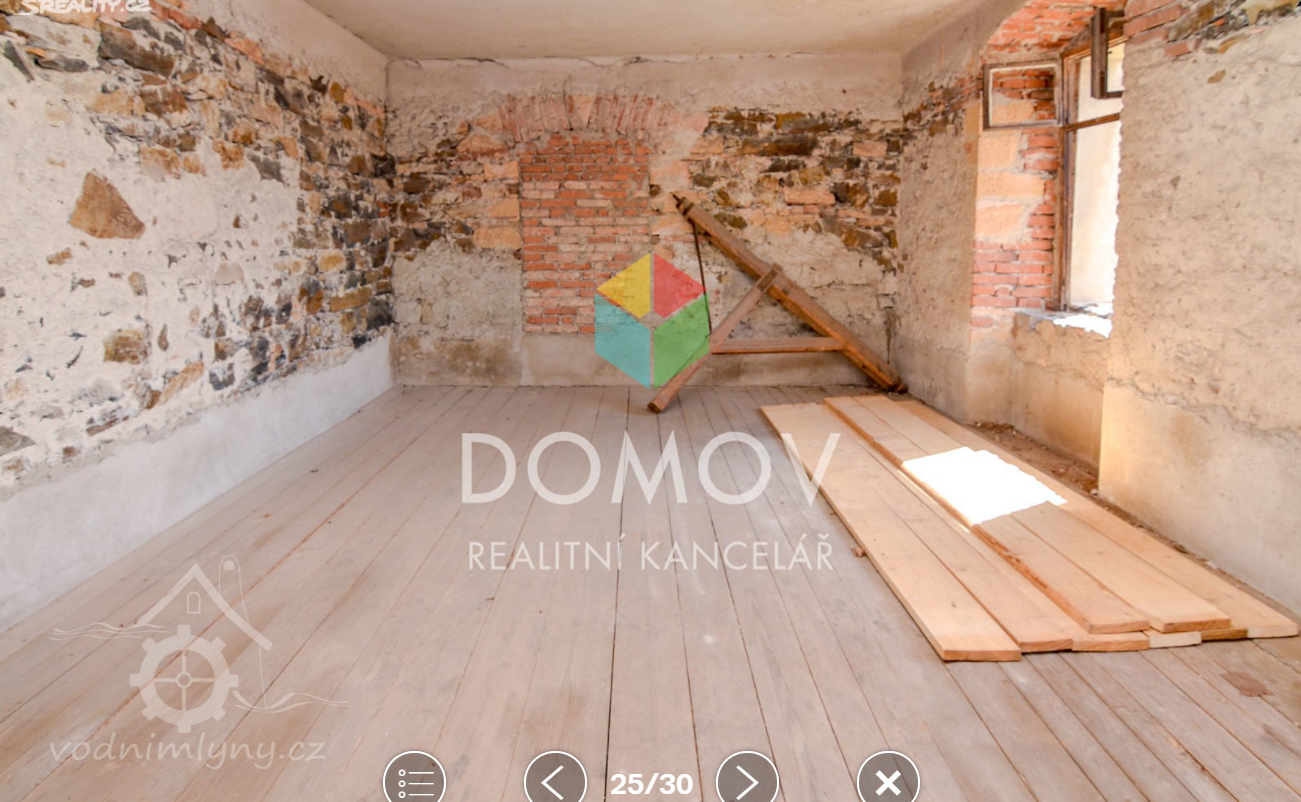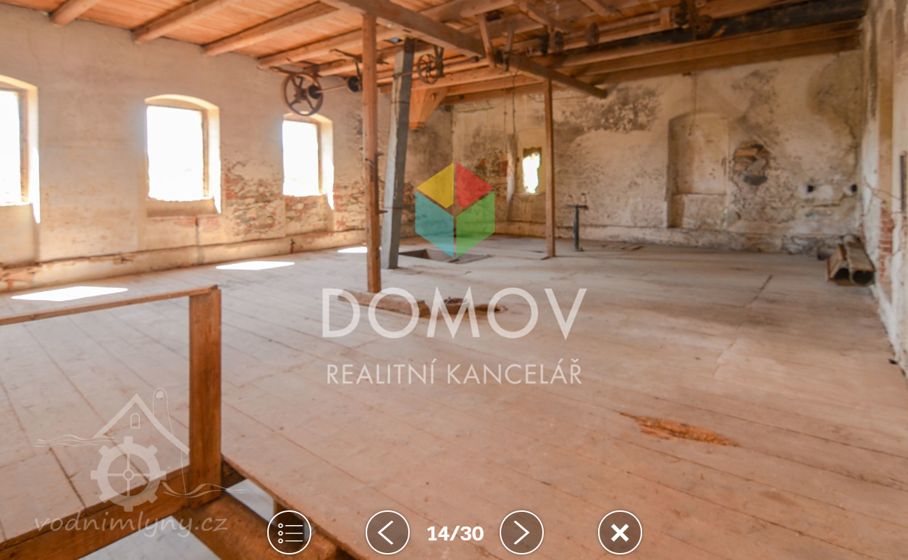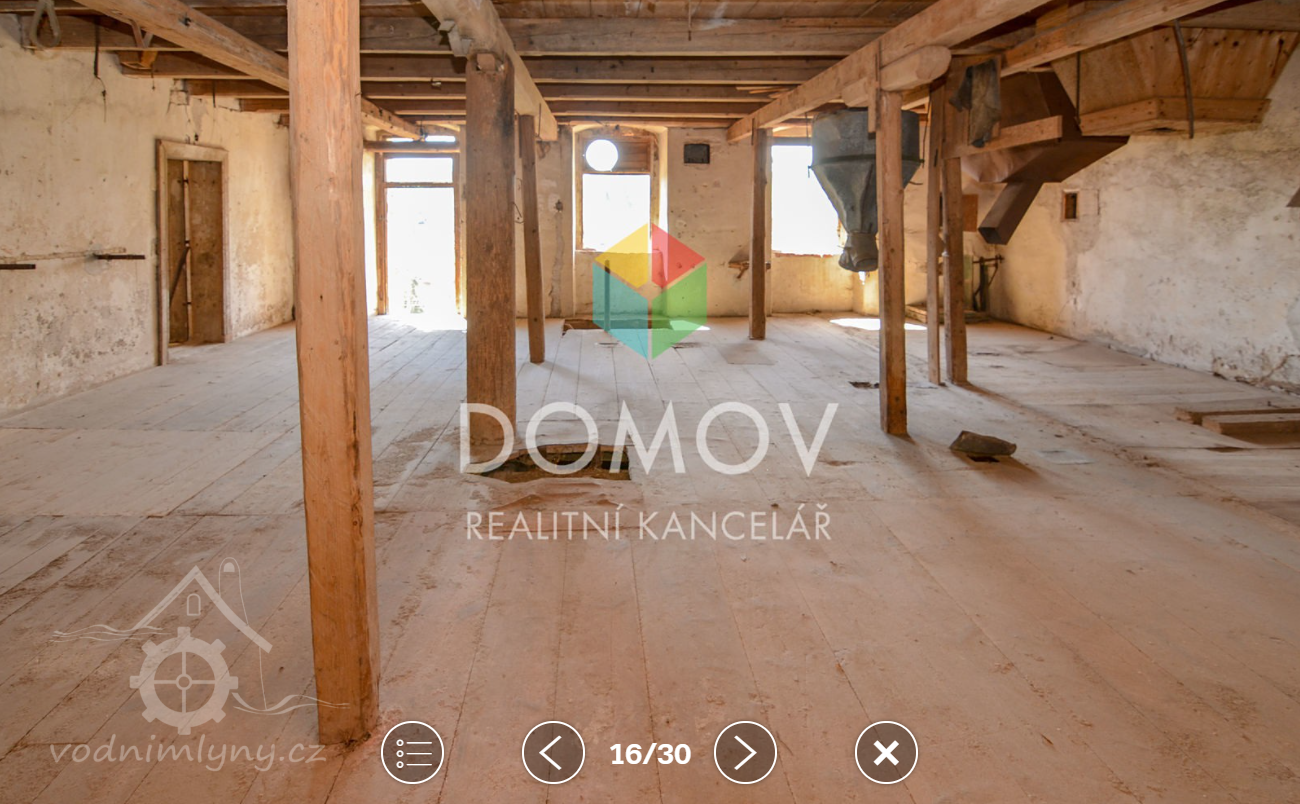 Díky zasazení do svahu nás hlavní vstup do budovy zavede do třetího nadzemního podlaží, které se skládá z prostoru mlýnice a obytné části. Obytná část se skládá ze vstupní haly se schodištěm, třemi pokoji a komorou. Po schodech směrem nahoru se dostaneme do 4.NP, kde se nachází obrovský prostor půdy, který je vhodný pro vybudování dalších obytných částí. Směrem dolů se pak dostaneme do skladovacích prostor v 2. NP. Ty se skládají ze dvou místností určených pro skladování a jedné místnosti, kde se nachází stará pec a schodiště do 1. NP. Toto schodiště nás dovede do prostor maštale s chlívy. Z této části pak vedou dveře na pozemky náležící k nemovitosti. Z mlýnice ve 3.NP se pomocí schodiště a žebříků dostaneme do jejích dalších částí umístěných v nižších patrech. Na mlýnici v 2.NP pak navazuje obytná část složená ze dvou pokojů.