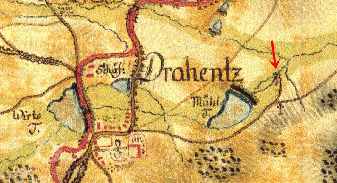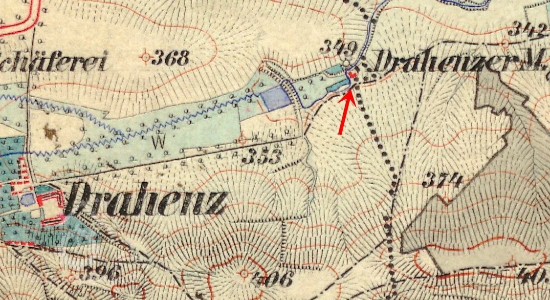 Mlýn stávala asi 1,2 km SV od středu obce Drahonice.
