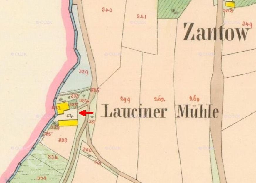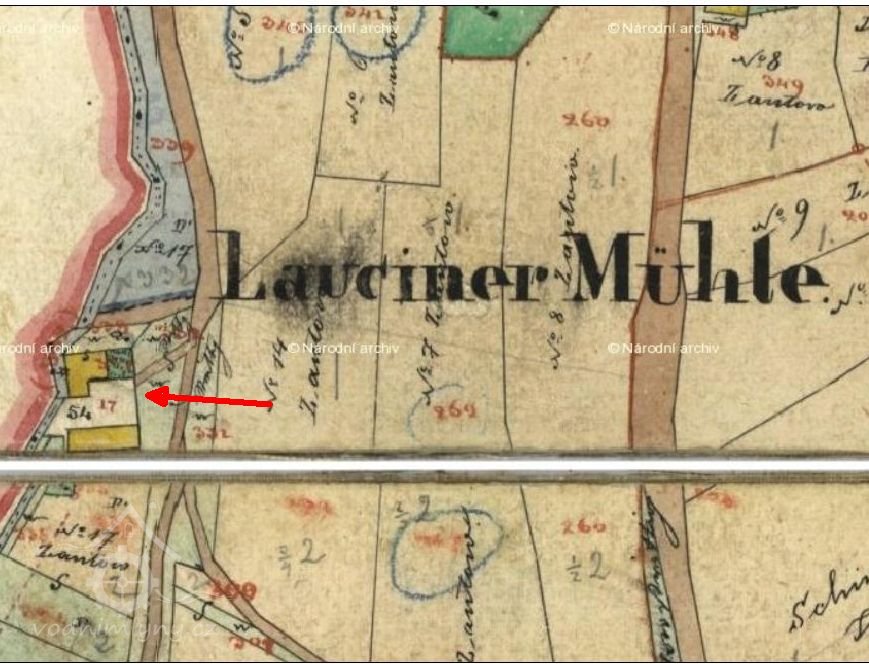 1748 Tereziánský katastr: mlýn s dvěma koly a jednou stoupou