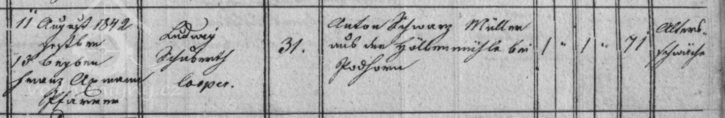 Posledním známým mlynářem na Pekelném mlýně byl Joannesův syn Anton. Nevím, jak dlouho po Antonově úmrtí zůstal Pekelný mlýn v majetku či nájmu Schwartzů. Každopádně ještě v roce 1848 se na Pekelném mlýně narodil Anton, vnuk posledního mlynáře Antona a syn jeho dcery Theresie, nar. 1810.