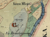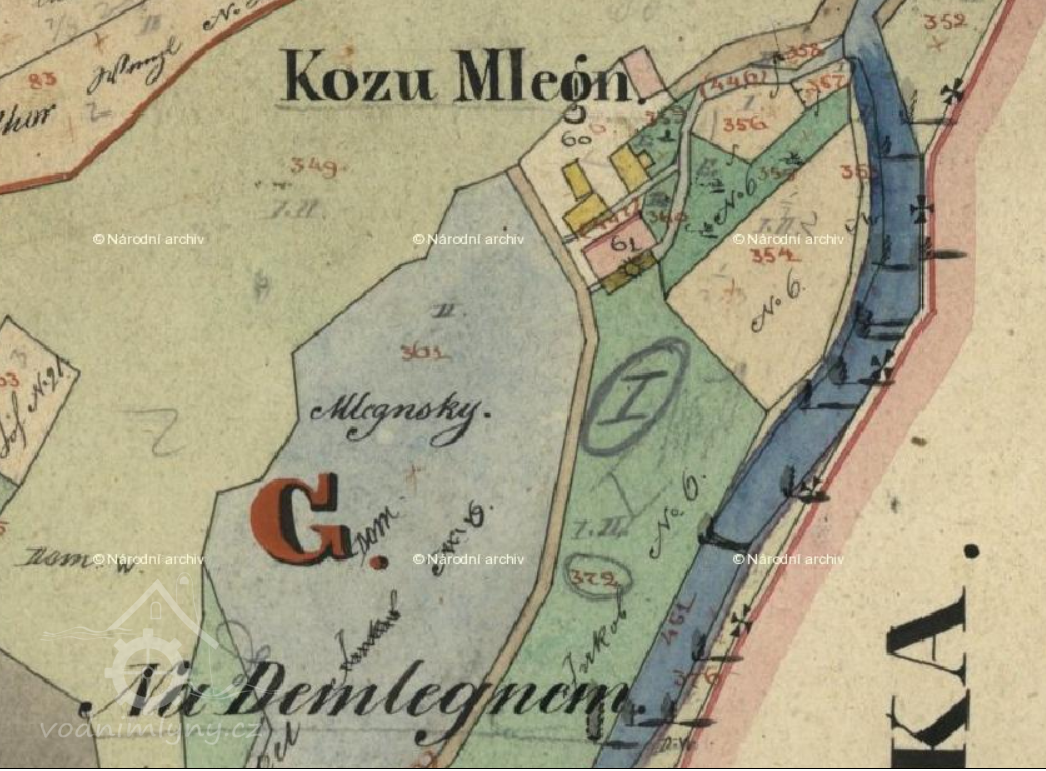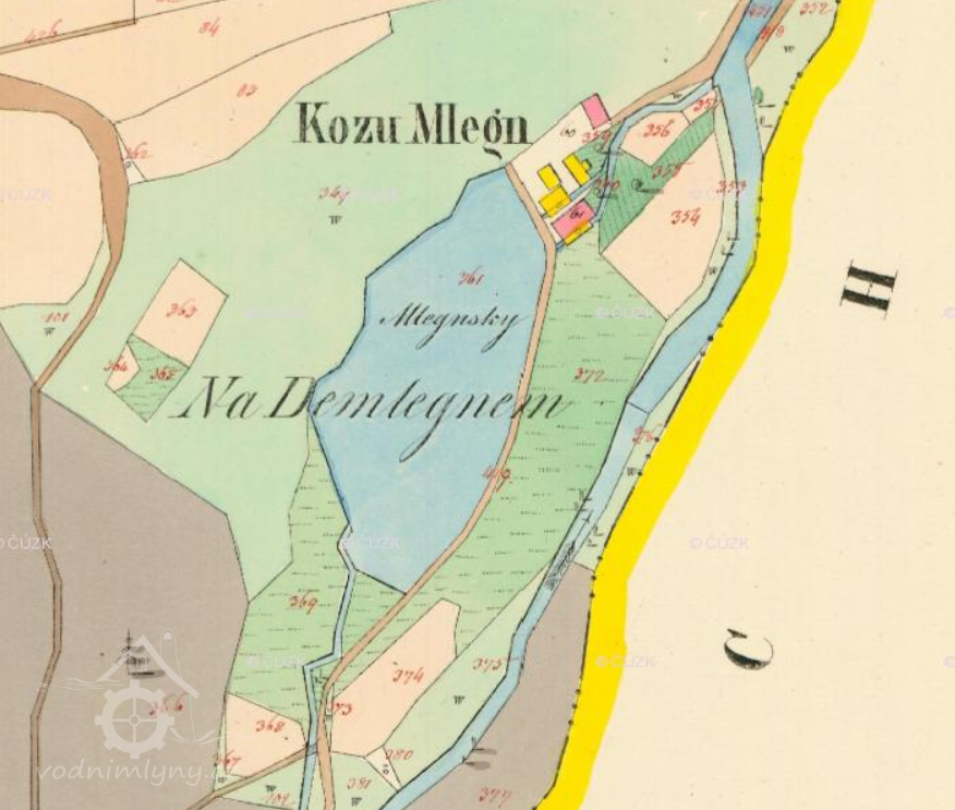 1877: jez 5,7 široký, vod do mlýnské strouhy regulována satvidlm, teče do mlýnské nádržky (poměrně velký rybník), jejíž hrází vede 9 m dlouhá strouha se stavidly, přivádějící vodu na vantroky, dlouhé 5,3 m, odtud padá na 2 kola, jiná strouha z nádržky, dlouhá 5,78 m, vede vodu na kolo pily.