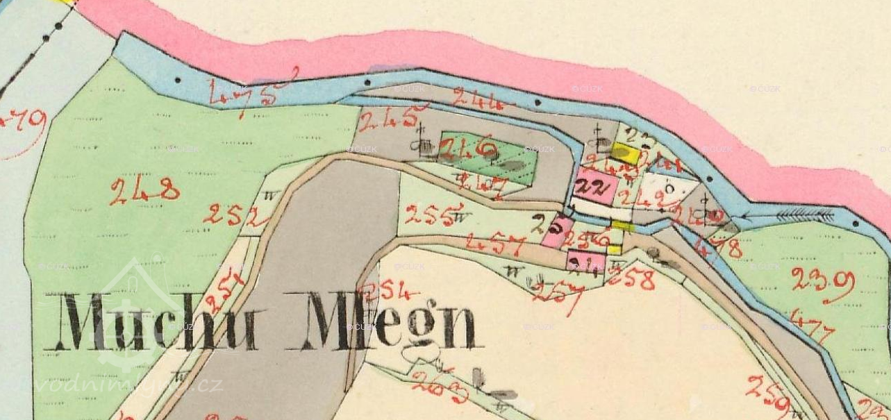 PopisV r. 1930 zde byla 2 kola na svrchní vodu, průtok 0,14 + 0,105 m3/s, spád 3,3 m, výkon 7 k.
