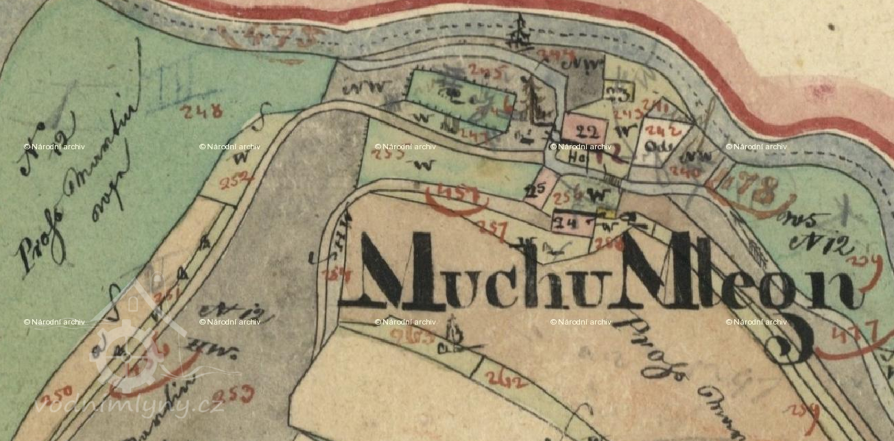 V soupisu poddaných podle víry z roku 1651 je uváděn mlynář Jiří Moucha se svoji matkou Mandalinou. Další zmínka je z Berní Ruly z roku 1654 – Uvádí se že v obci Radkovci je mlynář Jiřík Mucha, vlastnící mlýn o 1 kole. Také Tereziánský katastr se zmiňuije v roce 1757 o mlýnu. Uvádí se „Mlýn na stálé vodě o 1 kole, 4 stoupách a jedné olejně“ V té době vlastní mlýn rod mlynářů Muchů a podle něj se i tento mlýn nazývá Muchuv mlýn pod Radkovcem.