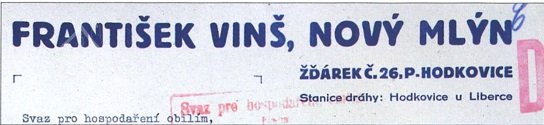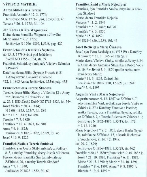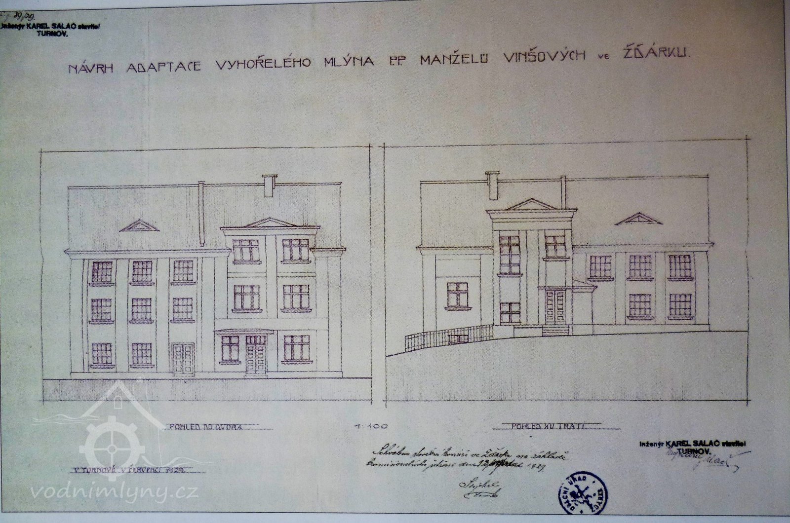 26. června 1900 koupil mlýn od manželů Rechcíglových Augustin Vinš za 31 900 korun. Jeho potomci na tuto událost vzpomínají takto: Jednoho dne se Augustin Vinš ze Žďárku čp. 7 vrátil večer z hospody domů a řekl manželce Marii, že koupil mlýn. Augustin se narodil v roce 1857 v rodině žďáreckého sedláka Františka Vinše a Terezie rozené Nejedlové rovněž ze Žďárku. V roce 1879 se v jenišovském kostele oženil s Marií, která se za svobodna jmenovala rovněž Nejedlová. (MH)