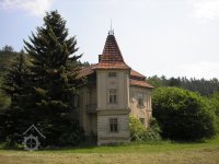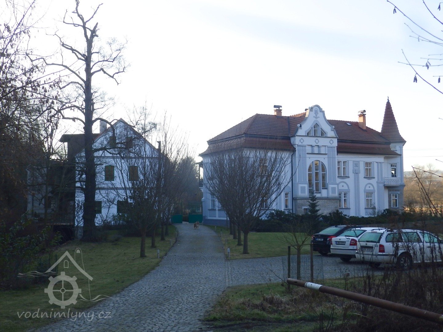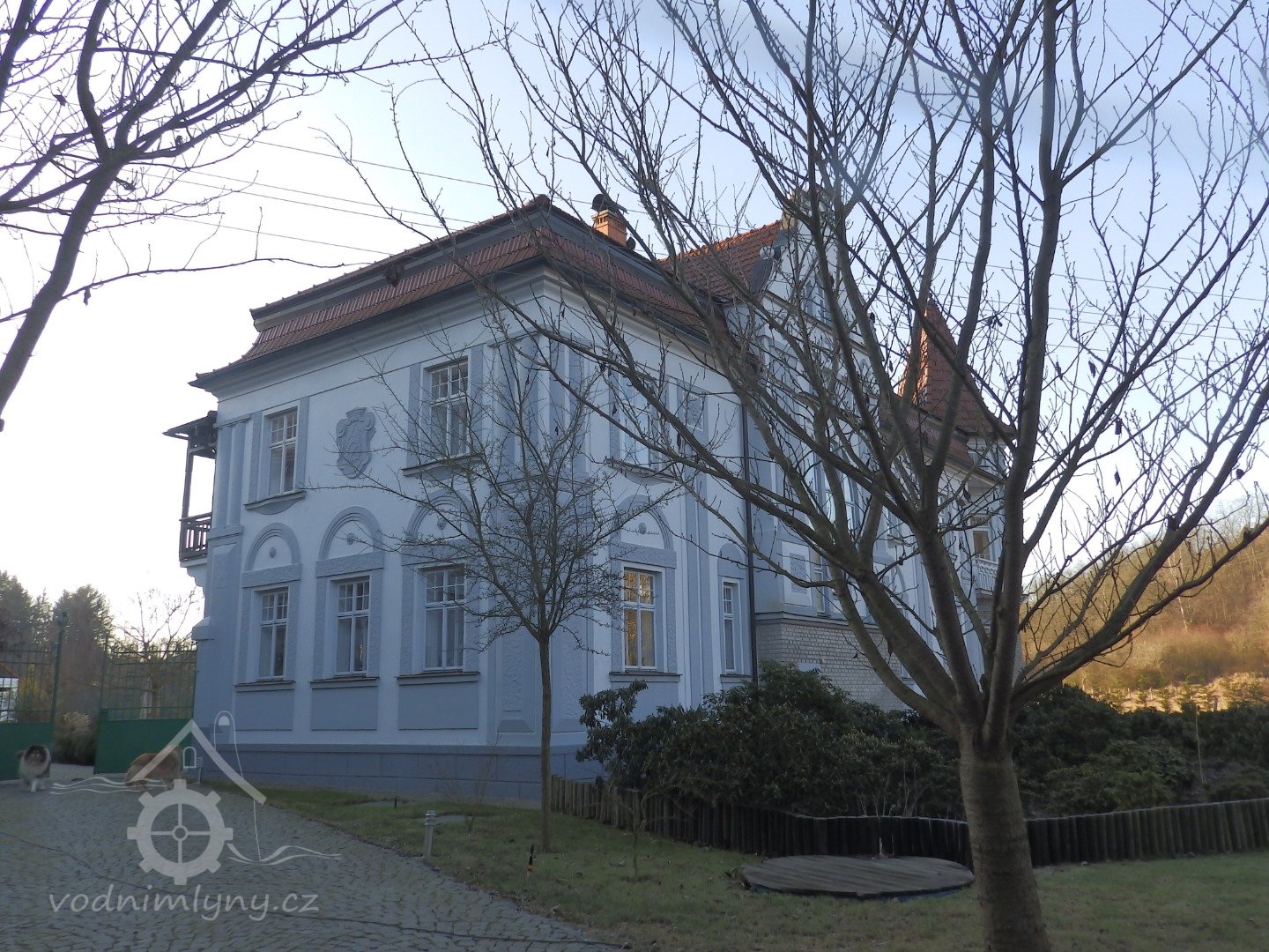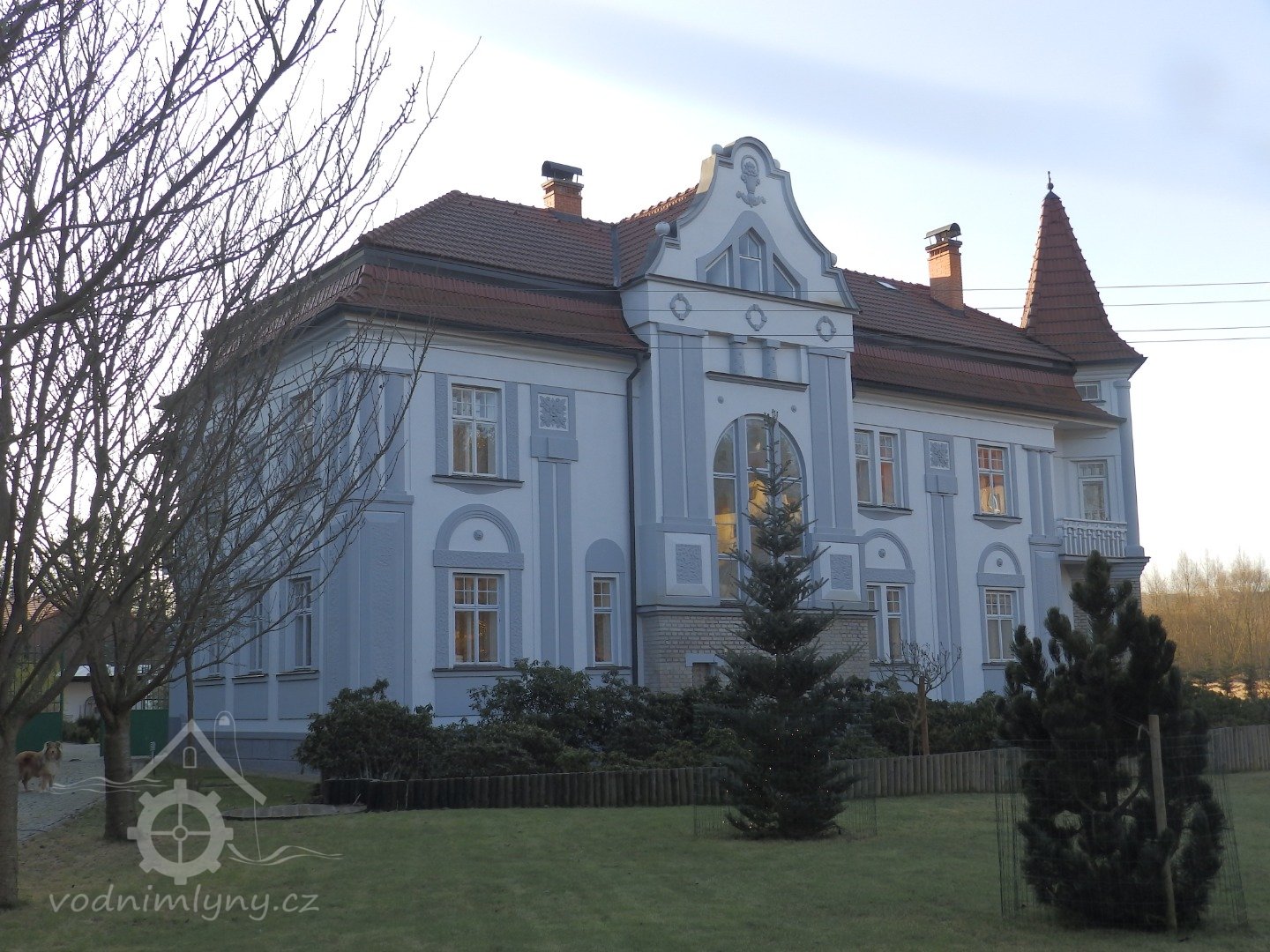 V úrovni přízemí pokračuje vlevo od hlubší části rizalitu, zakryté pultovou střechou, nesenou dřevěnou konstrukcí. Ta je pojata tak, aby opakovala motiv oblouku, včetně ozdob. Vpravo na rizalit v úrovni patra navazuje lodžie, krytá pultovou střechou. Nosná konstrukce střechy je dřevěná, opět třikrát opakuje motiv oblouku v přízemí, i když v trochu odlišné podobě. Rizalit má tři okenní osy, v nichž dvě se nacházejí na jeho hlubší části. Tyto okenní osy jsou shodné s osami oblouků v přízemí. Vlevo od rizalitu je možné v úrovni patra nalézt dvě okenní osy /v té vzdálenější jsou dveře na terasu mezi vilou a navazujícími stájemi/. Vpravo od rizalitu zbývá ještě jedna okenní osa, v níž jsou na rozdíl od všech ostatních dvojdílných oken umístěna okna trojdílná. Všechna okna včetně rámů, dveří, zárubní, zábradlí jsou ze dřeva, opatřena bílým nátěrem. Z téhož materiálu jsou všechny krovové a většina stropních konstrukcí. Střecha je mansardová, přičemž spodní část představuje asi třetinu výšky střechy. Krytina pálená - drážkovky. Přízemí vily sloužilo spíše jako plocha provozní, - tj. kuchyně, chodba, hala, kancelář mlynáře /dodnes s původním inventářem/, sociální zařízení. Podlahy přízemí jsou opatřeny keramickými dlaždicemi s výjimkou haly a schodiště, kde byl použit bílý a růžový leštěný mramor. Téměř všechny dveře i zárubně v interiérech jsou zdobeny secesními motivy, zvýrazněnými zlacením. Pozornost si zaslouží mj. i leptané skleněné výplně oken na schodišti /rostlinné motivy/ a dvoukřídlých vstupních dveří do haly /zjednodušený pohled na původní mlýn s vodním kolem/. Schodiště je trojramenné, mezipodesty zdobeny dvoubarevnými mozaikami z leštěného mramoru. Zábradlí dřevěné, zdobené. V hale nad schodištěm j e dřevěný kazetový strop se secesními osvětlovacími tělesy. V patře je obývací pokoj, pánský pokoj /pracovna/, ložnice, pokoje pro hosty a koupelna. Podlahy kryty parketami, v pokojích z větší části zachován i původní, často secesní inventář, vč. válcových kachlových kamen.