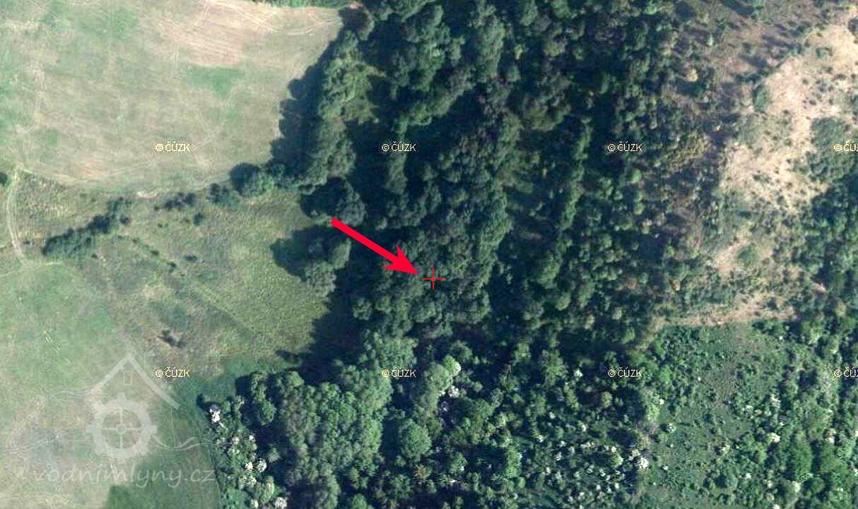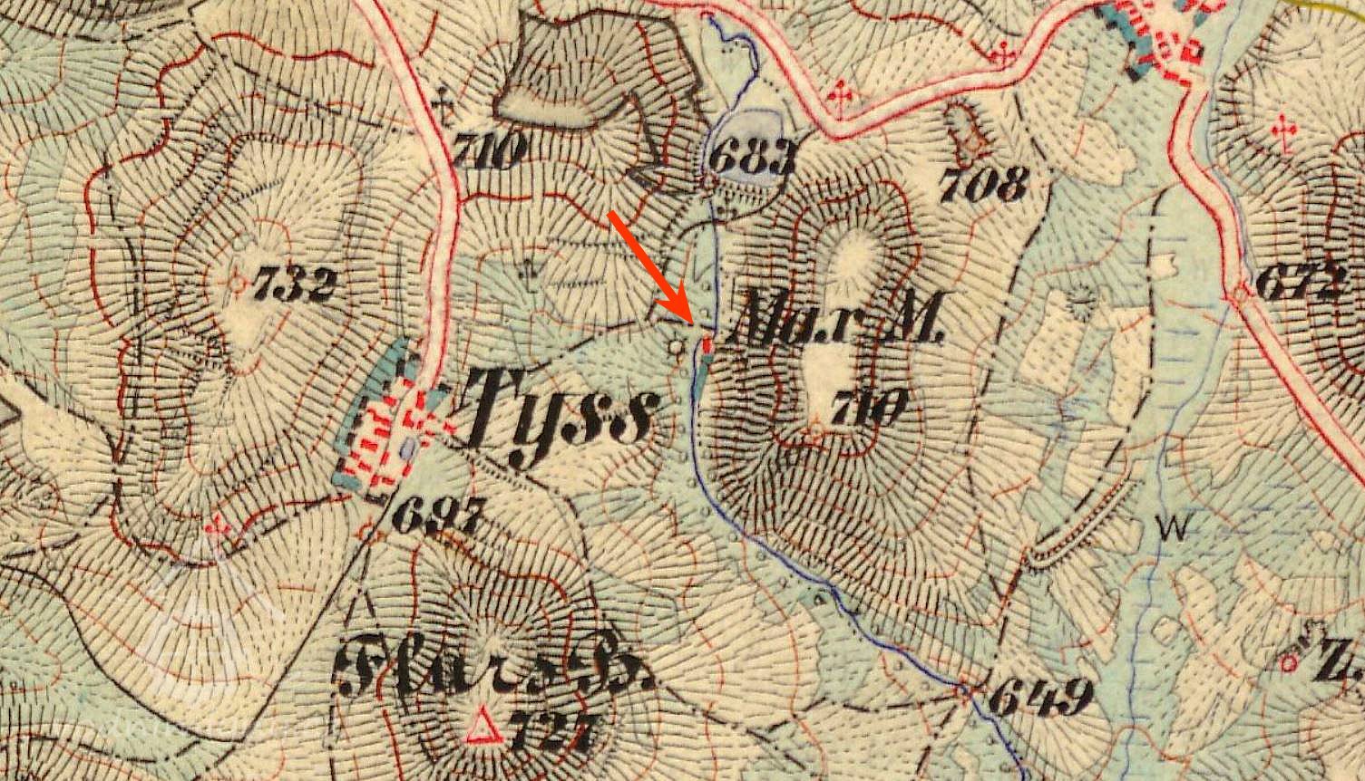 Na levém břehu Klein Giessbachu, známého pod novějším názvem Malá Trasovka zhruba 400 metrů na východ od dnes zaniklé obce Tis (Tiess), byl v druhé polovině 18. století vybudován mlýn Maxmühle. Budova vodního mlýna se poprvé objevuje na mapě 1. vojenského josefského mapování probíhajícího mezi lety 1764-1768. Vodní kolo, které bylo umístěné na severní straně budovy mlýna, poháněla voda potoka proudící náhonem z blízkého rybníka "En Teich".