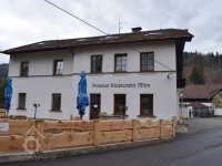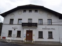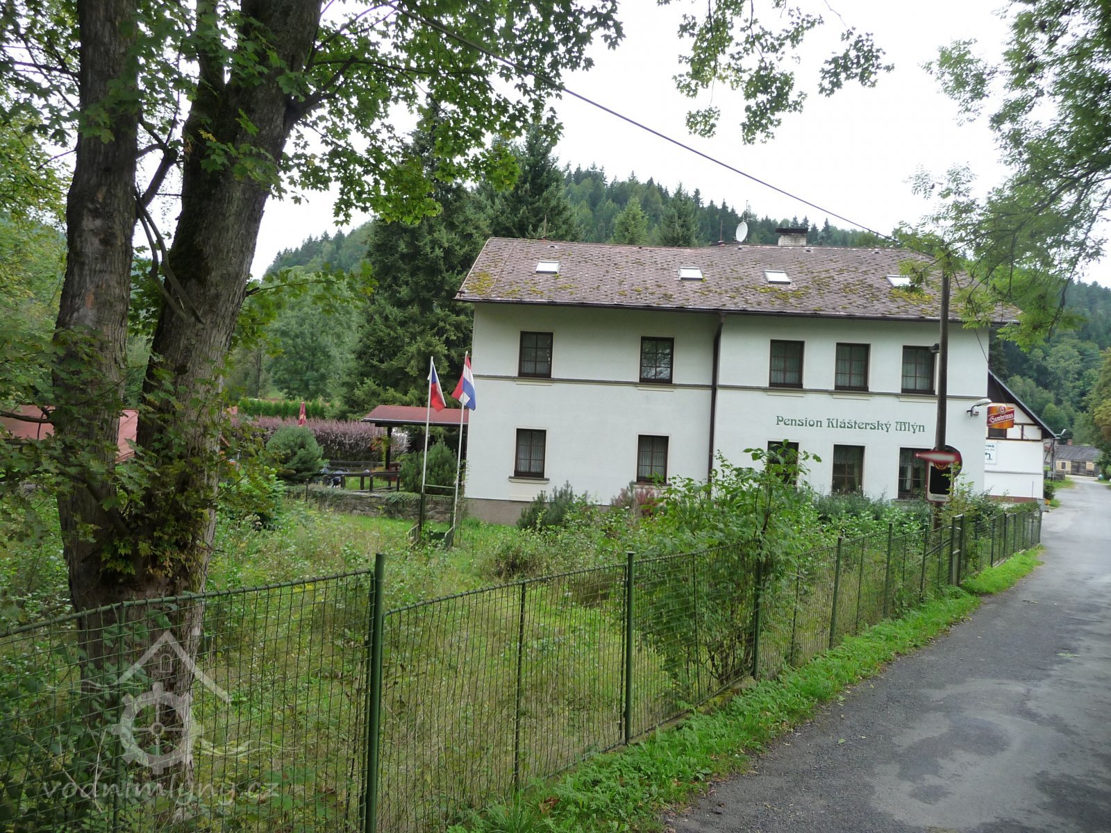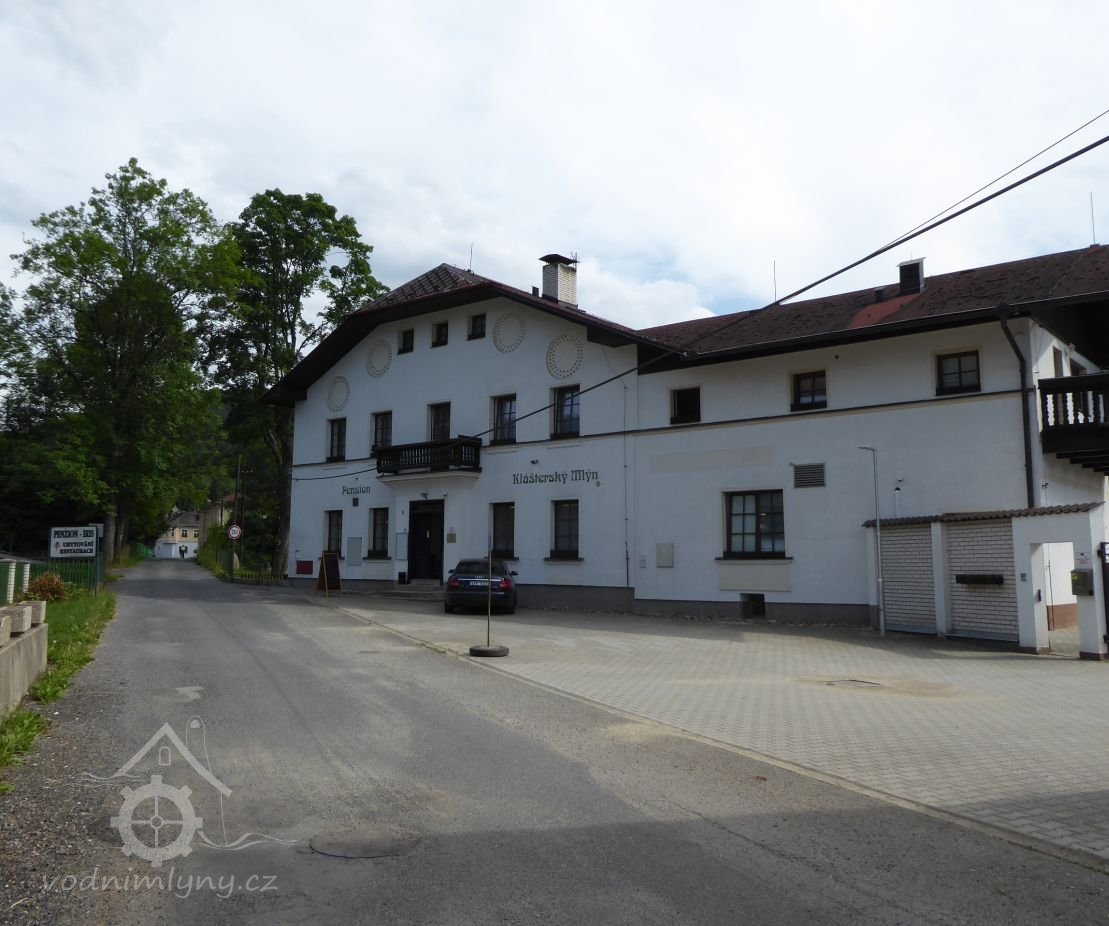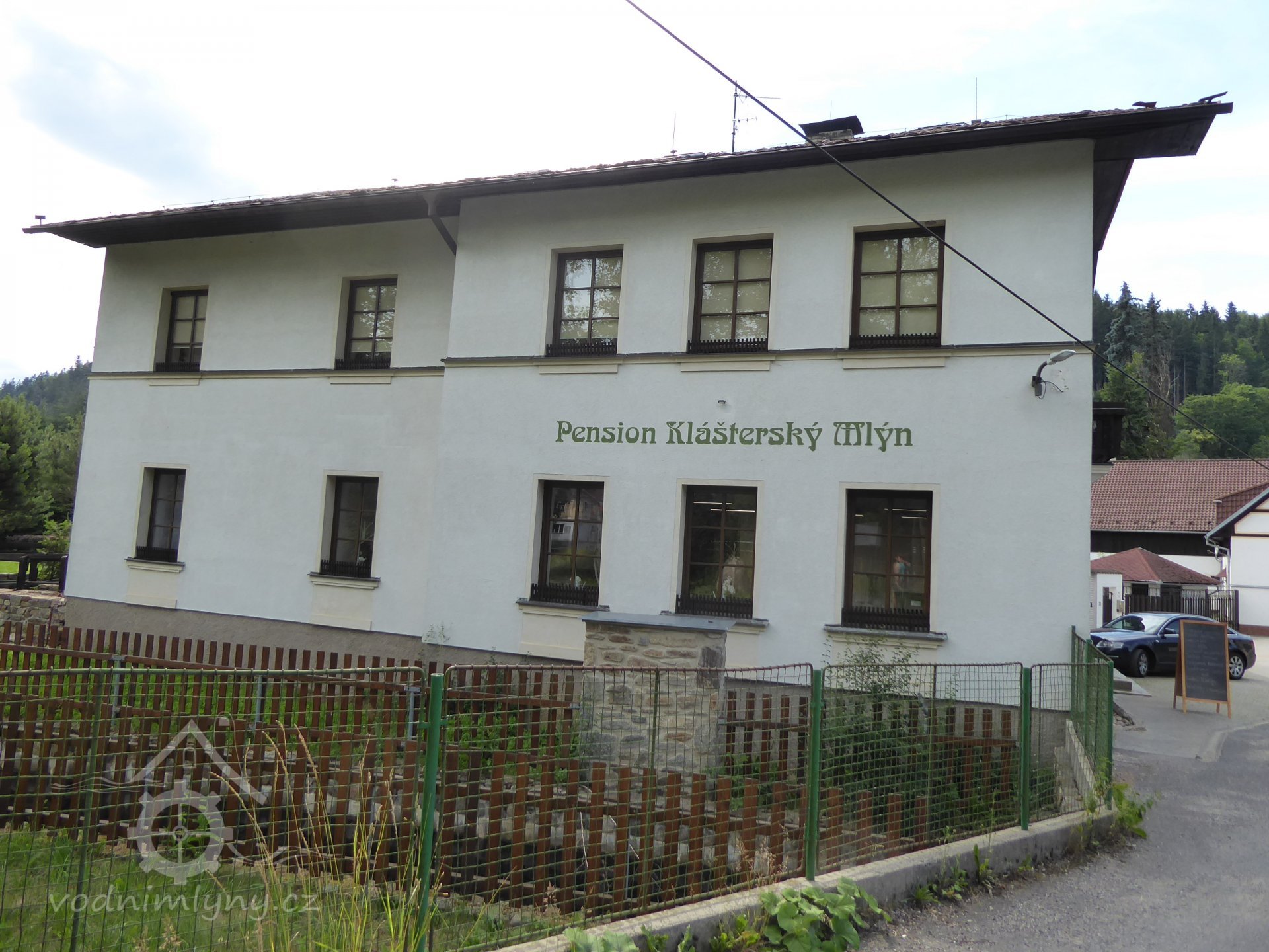 Na omítce štítě je nápis "Klášterský mlýn" a "Penzion" a stylizace mlýnských kol
