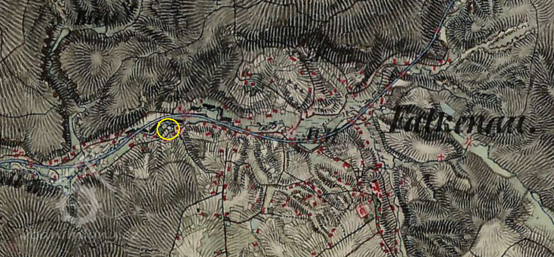 Ve  Falknově existovala vrchnostenská pila z r. 1670. Voda k ní byla přiváděna z řeky Kamenice. Náhon začínal právě poblíž hutě a pod pilou přes řeku Kamenici byl most. Tato pila byla v roce 1796 prodána pilaři Antonu Münzelovi, původem z Krásné Lípy. Ten pilu v roce 1798 přestavěl na obilný mlýn, který pak měl právo nejen mlít obilí, ale i provádět výčep vrchnostenského piva.