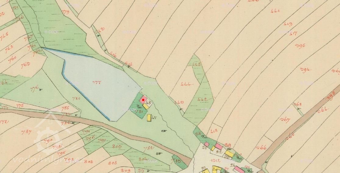 1930: 2 kola na svrchní vodu, hltnost 0,231 m3/s, spád 4,5 m, výkon 9 HP
