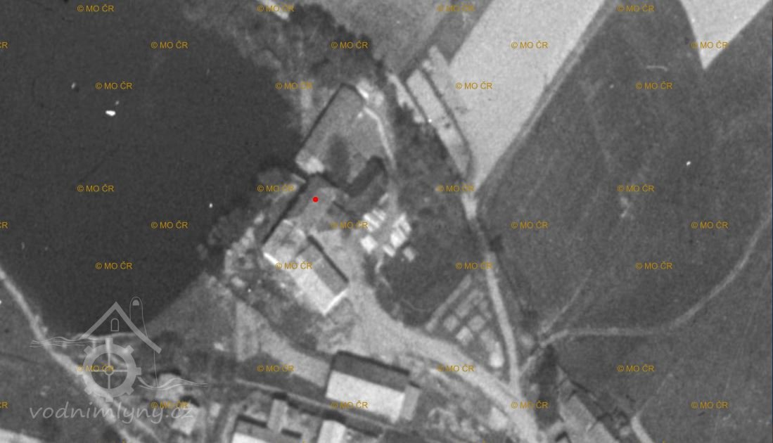 Rozsáhlý areál vodního mlýna pod hrází rybníka na konci obce obklopený hospodářskými budovami.
