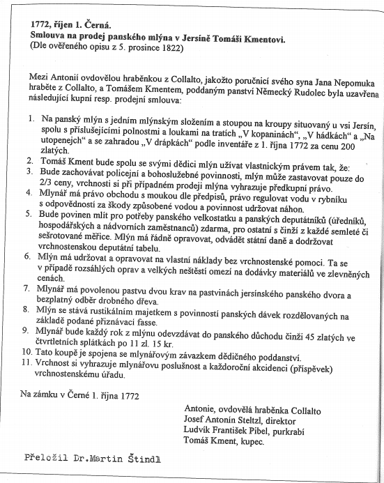 Dne 1.října 1772 prodala hraběnka Antonie Collalto mlýn se všemi k němu náležejícími polnostmi, za částku 200 zlatých rýnských, rudoleckému poddanému Thomasi Kmentovi. Mlýn byl v té době opatřen jedním chodem na mouku a výrobnou krup, a patřily k němu polnosti a louky o celkové výměře 20 a ¾ měřice, tj. 3,98 ha. Tyto se nacházely v tratích pojmenovaných "V kopaninách", "V hádkách" a "Na utopených", a dále zelná zahrada, o výměře ¼ měřice, v trati zvané "V drážkách", přičemž tato půda byla osvobozena od povinnosti platby desátku. Mlynáři Kmentovi, ale i dalším nabyvatelům mlýna, však byla uložena věčná povinnost každoročně platit roční nájem 45 zlatých do důchodu panství v Černé. Platba měla být prováděna vždy čtvrtletně předem a to ve výši 11 zlatých a 15 krejcarů.