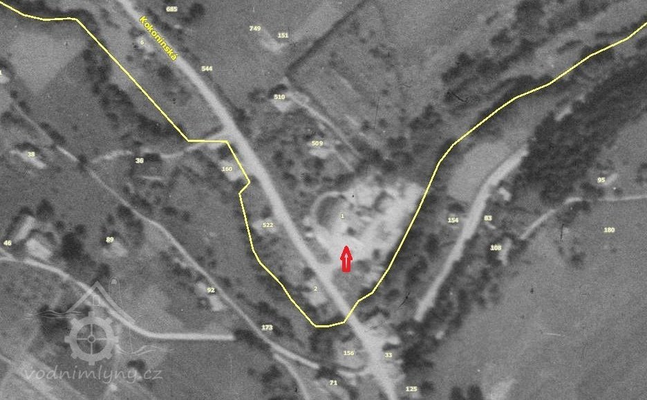 Budovy na půdorysu písmene U. Po pravé straně mlýn spojený úzkým krčkem se stájemi, na druhé straně u cesty prostorná stodola.