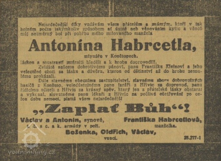Roku 1743 Susanna Zimmermannová prodala mlýn v Konětopech Matěji Königstätterovi za 500 zlatých. Matěj Königstätter mlýn prodal 1. ledna 1757 za 550 zlatých Františkovi Müllerovi. 6. ledna 1786 převzal mlýn jeho zeť František Haberzettl za 982 zlatých 49 krejcarů.