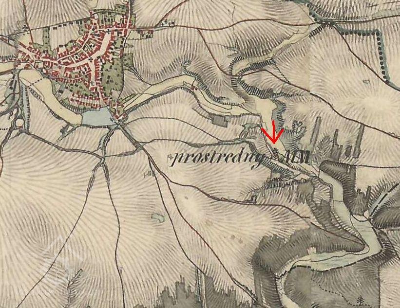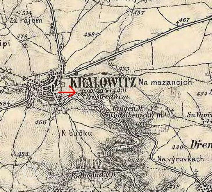 V údolí pod Podměstským mlýnem na Kralovickém potoce je již v 17. století zmiňován Prostřední mlýn. Mohl mlít jen tehdy, když mlel Podměstský mlýn nebo když Podměstský rybník přetékal. Byl ze všech mlýnů na Kralovickém potoce nejmenší. Všechny nájemní mlýny měly za povinnost odevzdávat na radnici raky pro hostiny pořádané obcí.