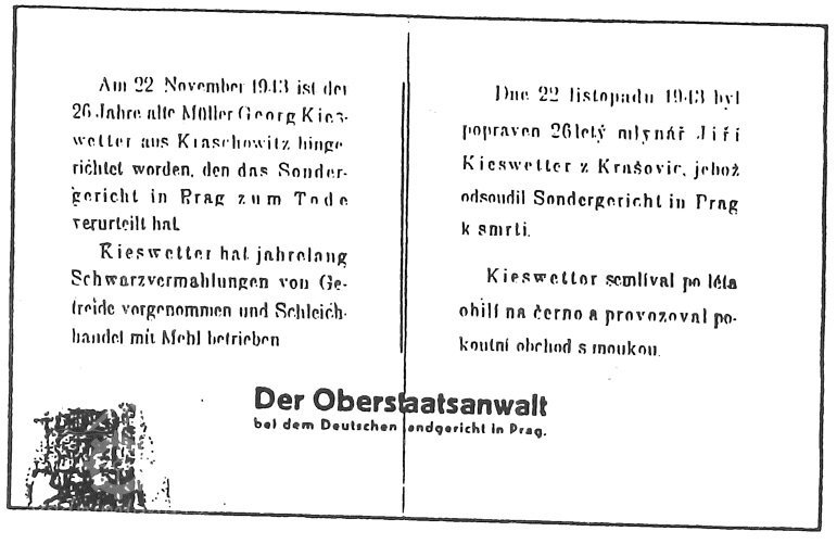 Po roce 1938 převzal mlýn syn Jiří Kiesswetter (*10.6.1917). 26. července 1942 přepadla mlýn náhlá kontrola (patrně na udání konkurence), do mlýna vrazili 2 revizoři,  jejich vedoucí gestapák Friedl (původem Čech z Domažlic) čekal v záloze s autem, obsazeným kriminální policií. Revizoři uhodili na Jiřího, že mele načerno a že mele více, než uvádí ve výkazech a Jiří, aby do toho nezatáhl další osoby, vše podepsal. Byl pak uvězněn v Justičním paláci v Plzni a po celý týden přivážen na mlýn, aby se pokračovalo v kontrole. Po roce byl převezen do Prahy na Pankrác. Do krašovického mlýna byla dána nucená správa - komisař Richard Spatzier, který zde působil až do 5.5.1945. Bydlel sice v Praze, ale každý den sem dojížděl, zabral pro sebe dva nejlepší pokoje a kancelář. Měl sice pod palcem 13 mlýnů na Plzeňsku, ale tento se mu nejvíce zalíbil. Jiřímu, zaměstnanému na Pankráci v kartonážní dílně, se snažil co nejvíce přitížit. Mlynář Jiří Kieswetter byl 22. listopadu 1943 ve věku 26 a půl roku popraven nacisty na Pankráci na základě rozsudku potvrzeného K.H.Frankem. Před smrtí nacházel oporu v četbě evangelia, v den své popravy napsal z cely smrti rodičům a bratrovi dopis, zakončený slovy: "Je to má cesta, nelitujte mne."
