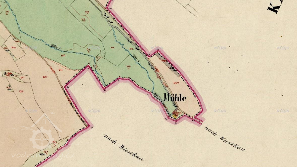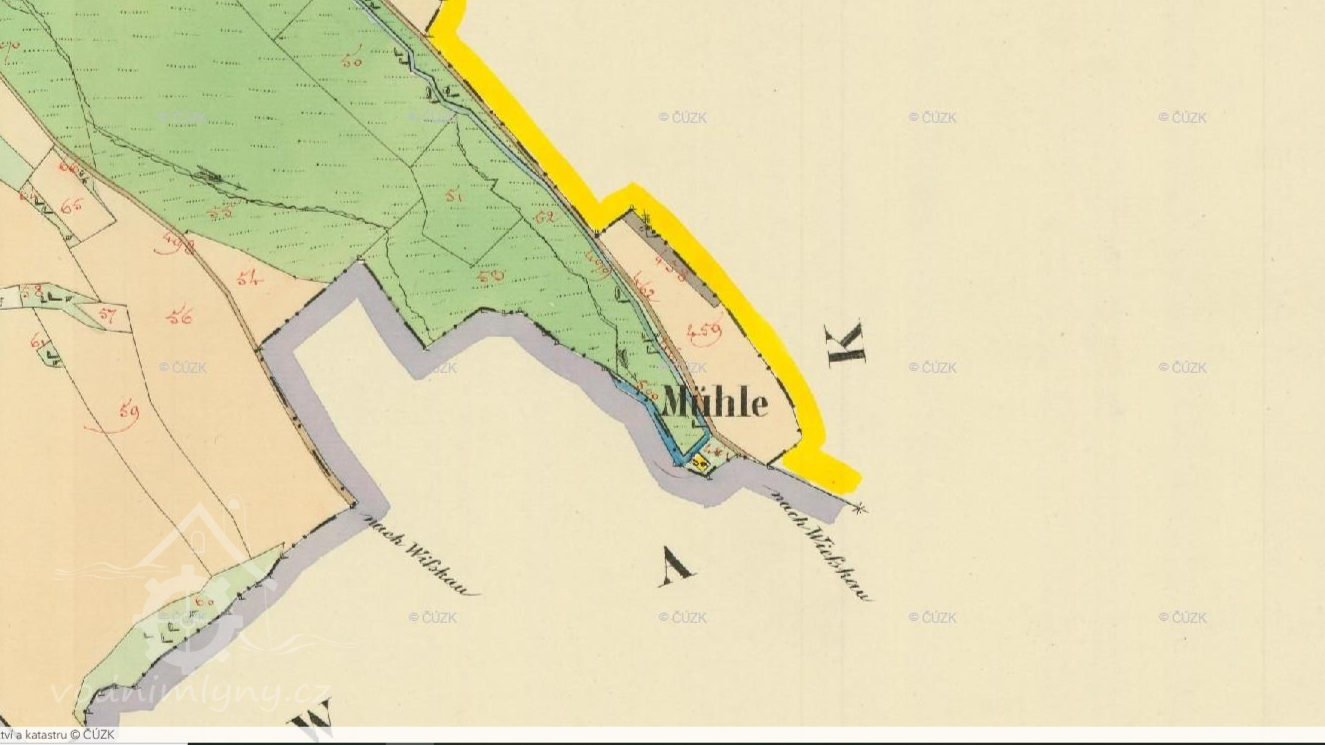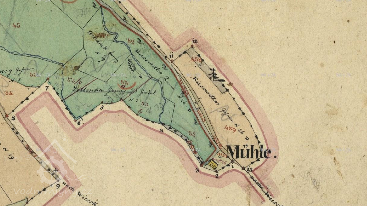 1894: mlýn se skládá z přízemí, dvou pater a podstřeší a je postaven vedle pily, se kterou má společnou lednici pro vodní kola.