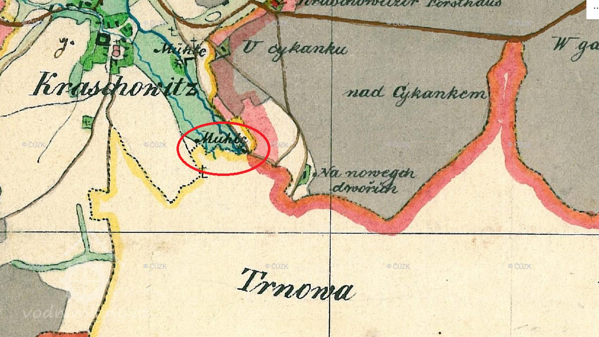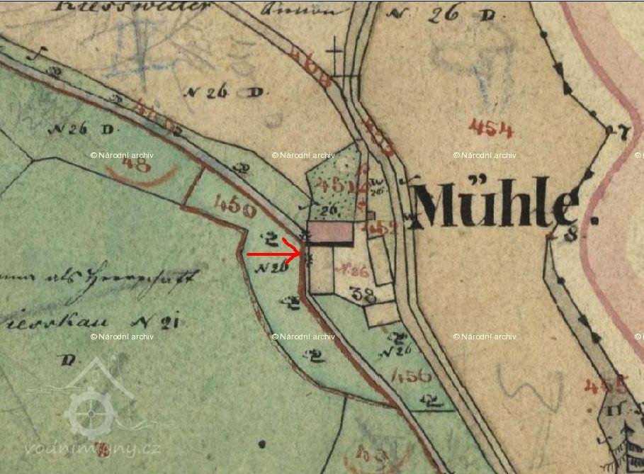 Podle mapy II. vojenského mapování se nacházela těsně pod Rašovickým rybníkem pila, níže po proudu, asi v polovině mezí Rašovicemi a Trnovou, se nacházel obilný mlýn. Podle indikační skici měl horní objekt 2 kola, dolní jedno. Historický obrázek označený jako Starý mlýn - mlýnec - odpovídá dolnímu objektu. (Ringo)