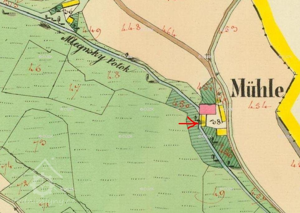 Na nejstarších vydáních mapy III. vojenského mapování je u horního objektu značka pila, u dolního značka mlýn. U pozdějších vydání jsou u horního objektu značky pila a mlýn, u dolního objektu značka mlýn. (Ringo)