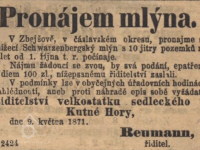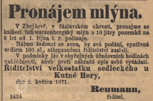 28.12.1869 od E. Truhláře odkoupil za 9 000 zl. rak.č. Karel kníže Schwarzenberg, mlýn nadále propachtováván, avšek neudržován a postupně chátrá