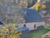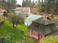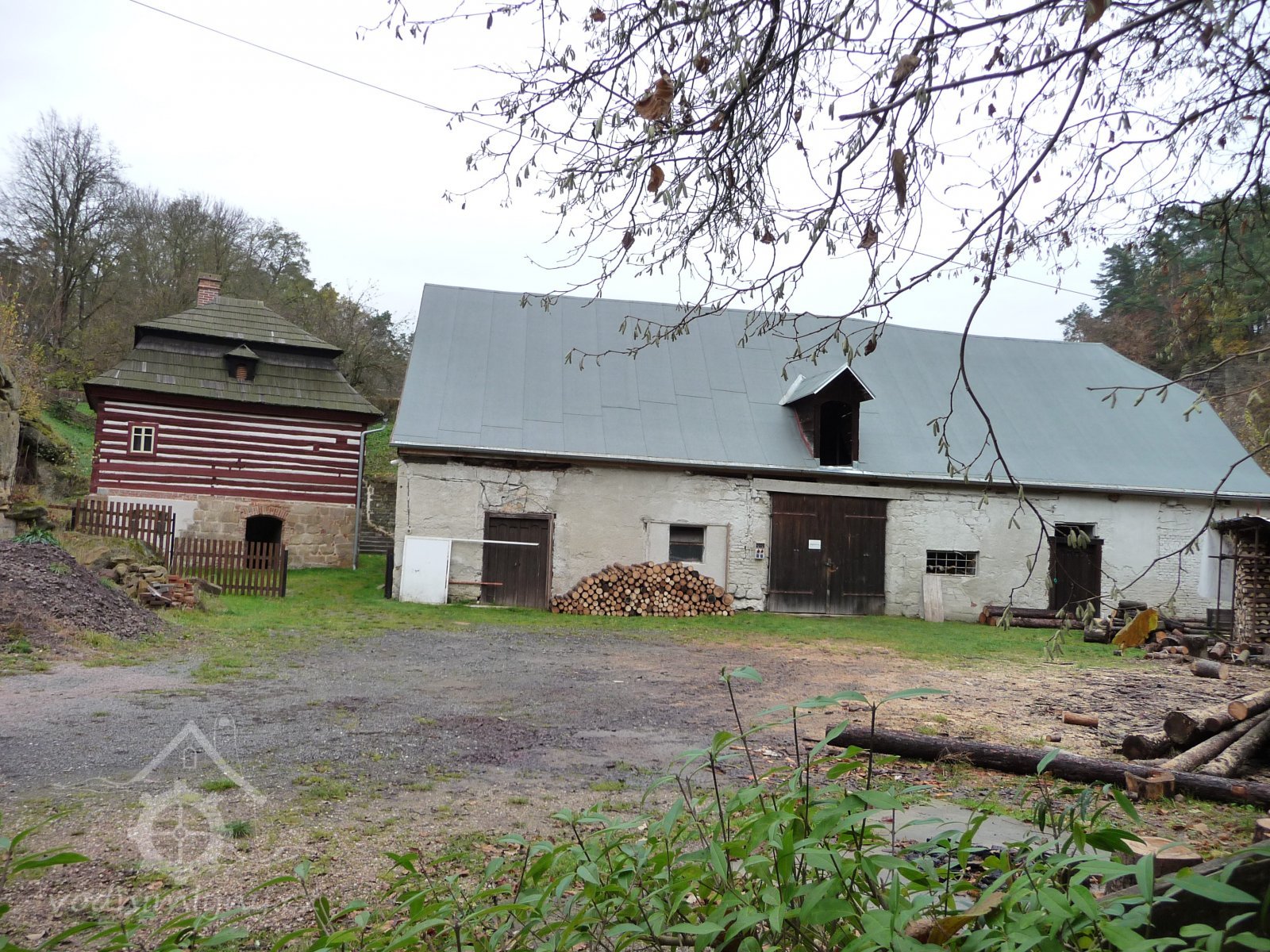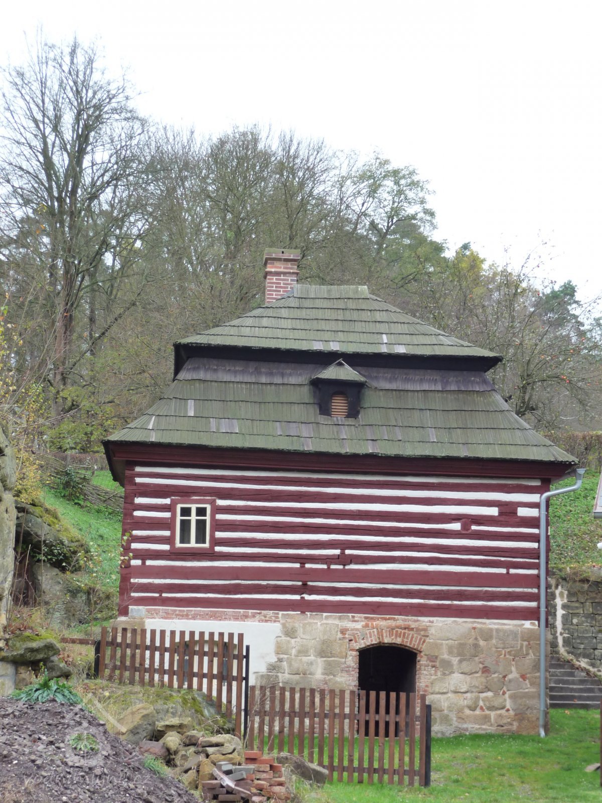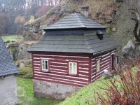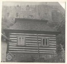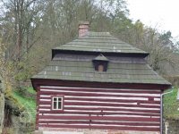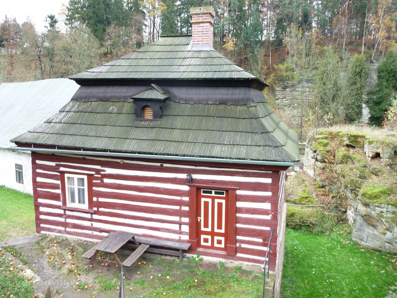 Zachovalá roubená čtvercová budova na kamenné podezdívce s mansardovou střechou.
