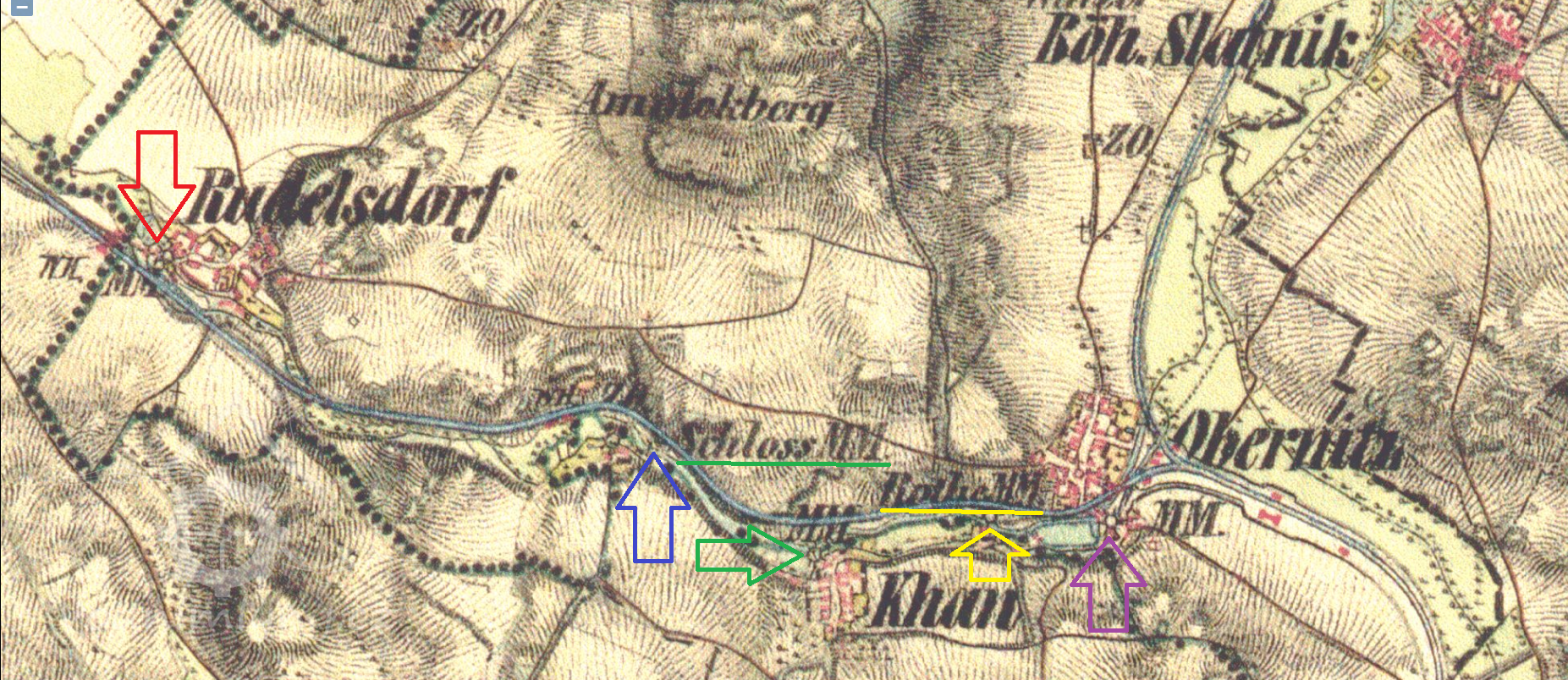 Mlýn na výběžku mosteckého katastru, zaklíněném mezi Rudolice a Chánov. Po roce 1950 zbořen, na jeho místě dnes elektrorozvodna pro sídliště Chánov, v těsném sousedství mostecká čistička odpadních vod.