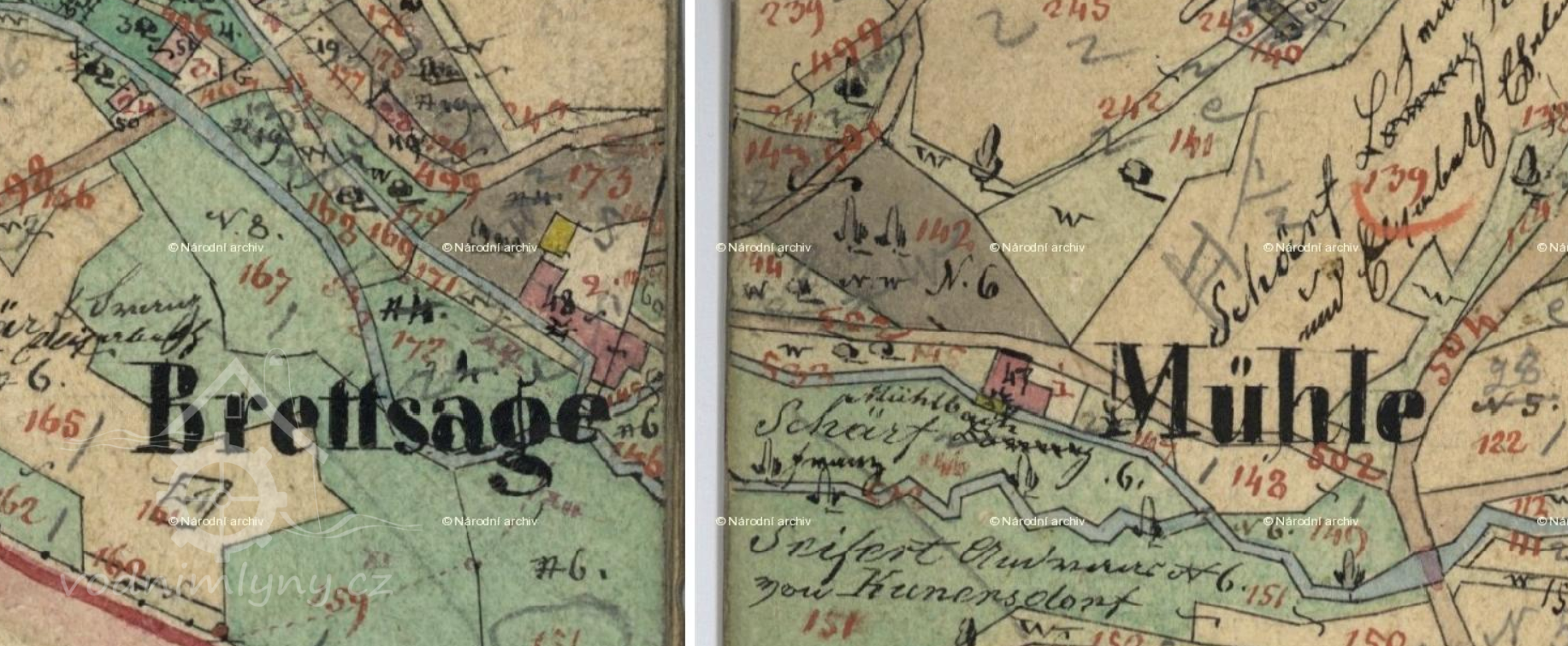 1840 majitel Vavřinec Schärf (mlýn), František Schärf  (pila)