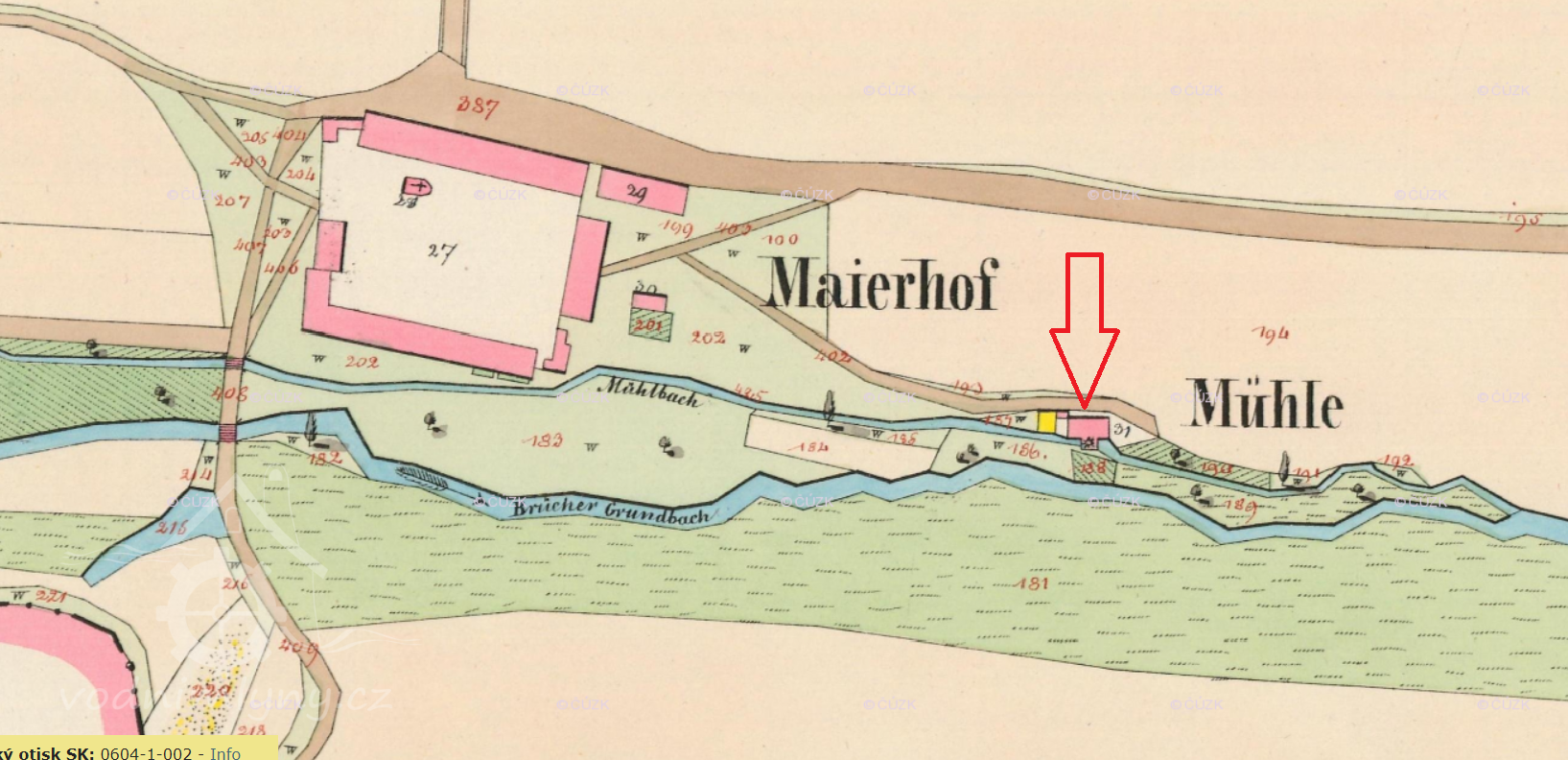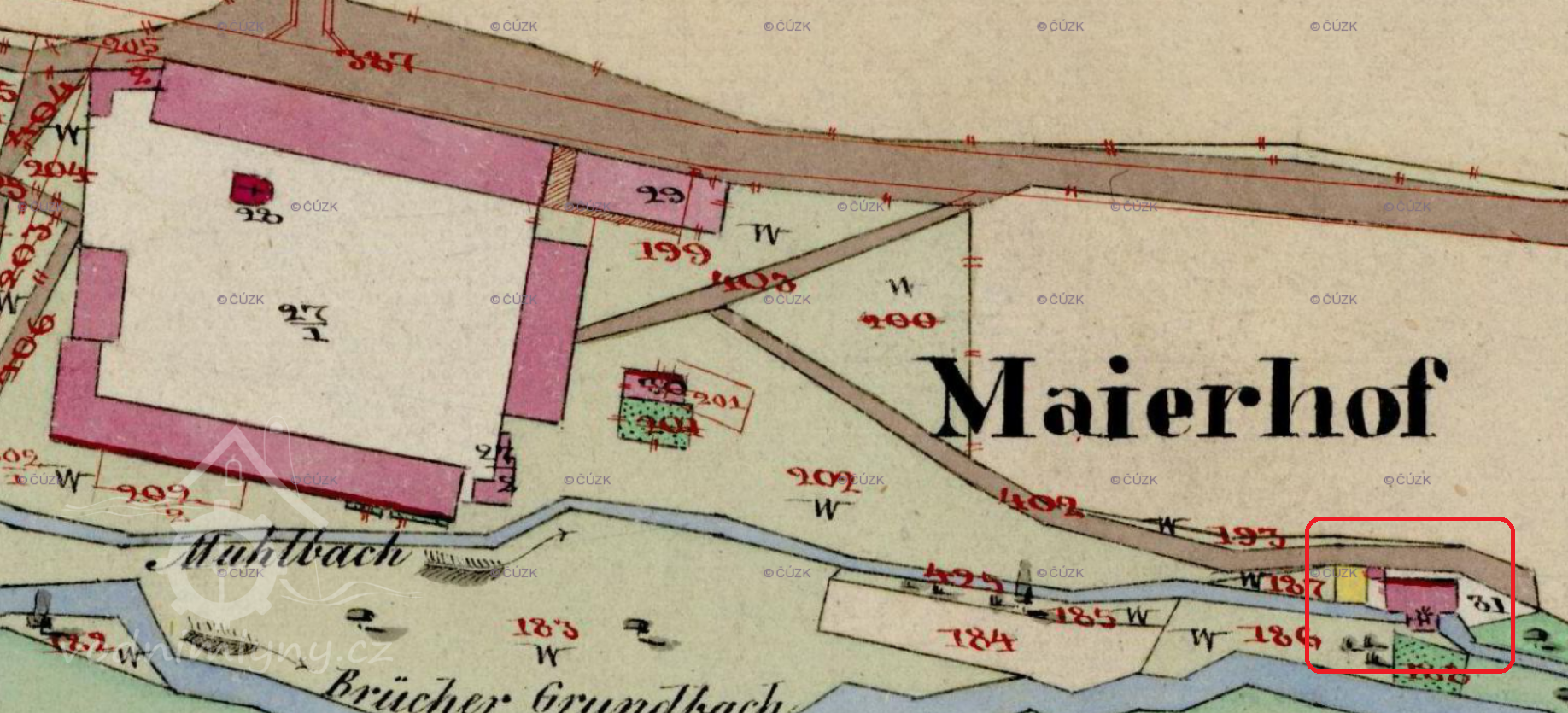 Malý mlýnek, příslušenství hospodářského dvora (původně grangia) cisterciáckého kláštera v Oseku. Zanikl za pozemkové reformy ve 20. letech 20. stol., v roce 1953 již není po mlýnu ani po dvoru ani stopy. Mlýniště dnes leží v areálu hnědouhelného dolu Bílina (původně Maxim Gorkij).
