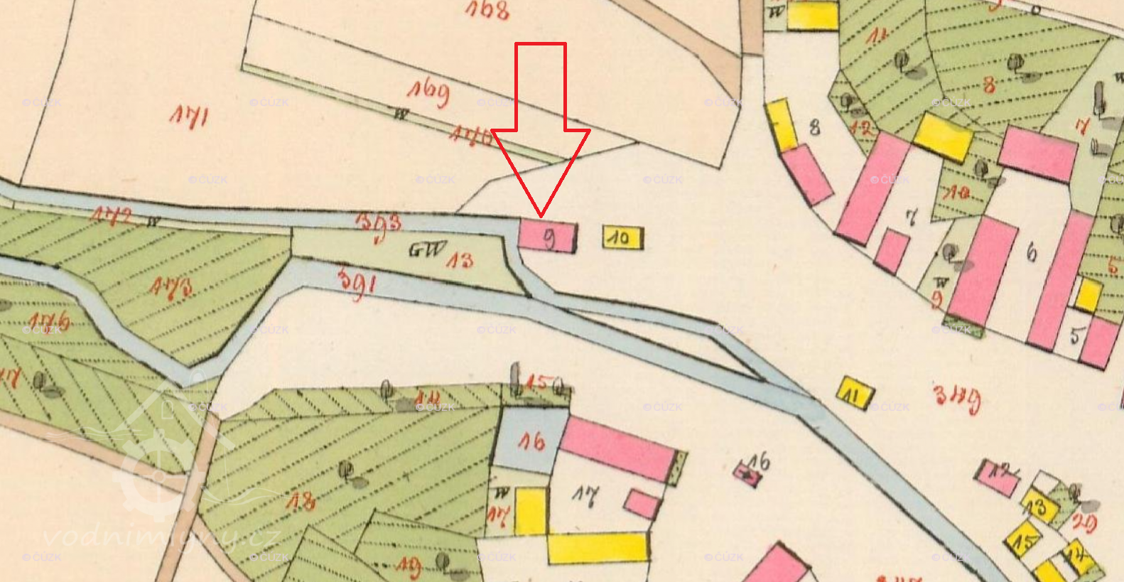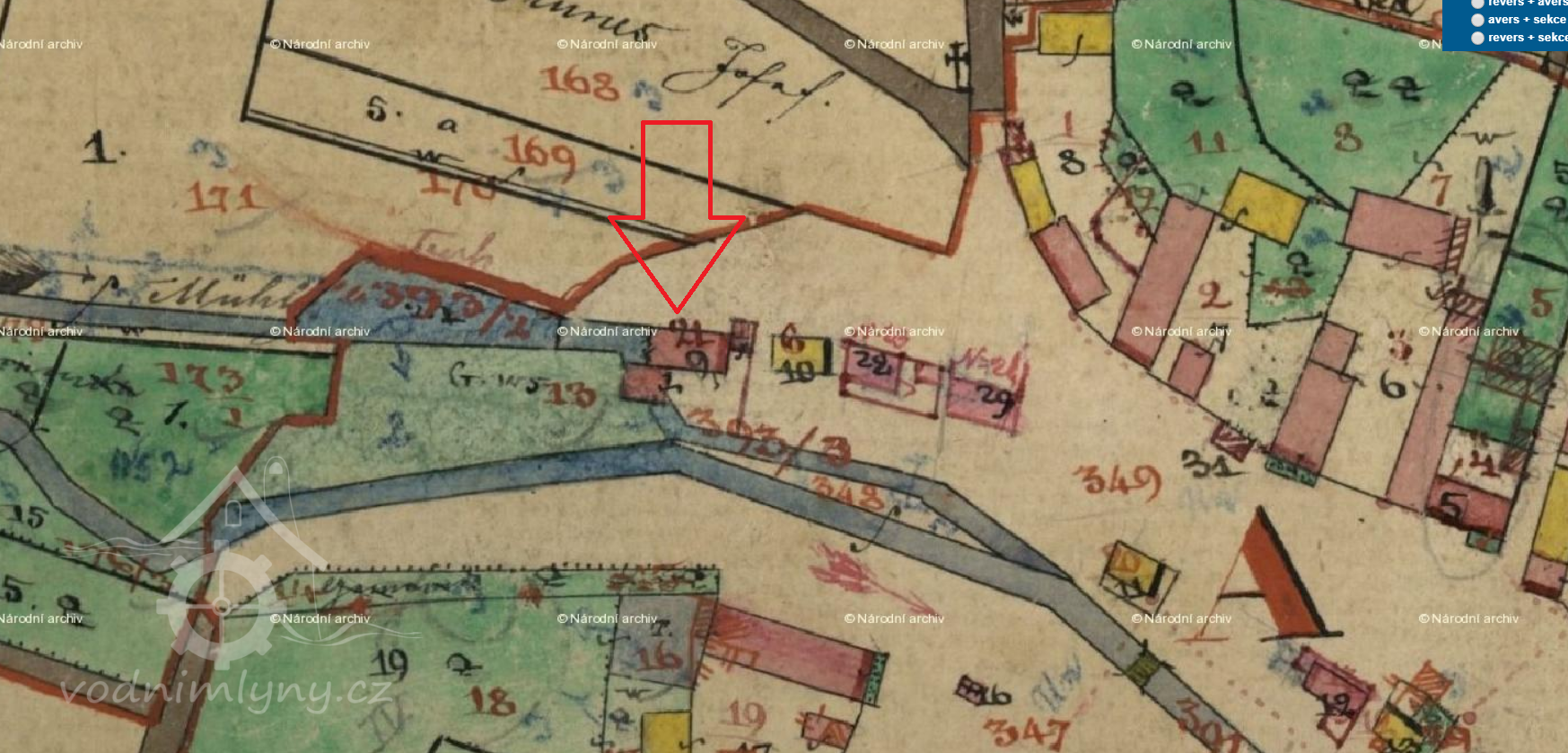 Popis1930: 1 kolo na svrchní vodu, hltnost 0,105 m3/s, spád 3,4 m, výkon 3 HP