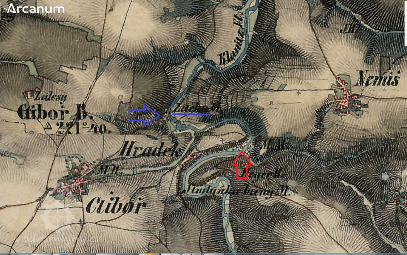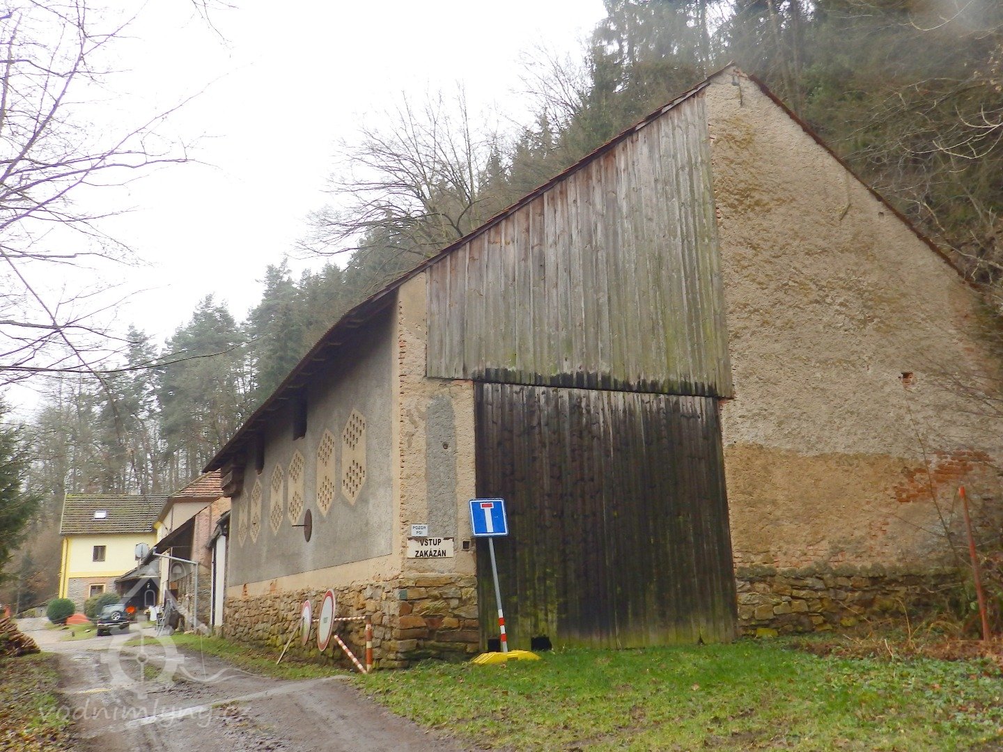 Dolní mlýn v Hrádku u Ctiboře, dnes malá vodní elektrárna. Původně průjezdní dvůr u mlýna byl před nedávnem uzavřen a turisté musí obcházet mlýn po krkolomné kozí stezce.