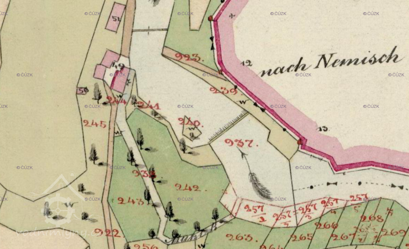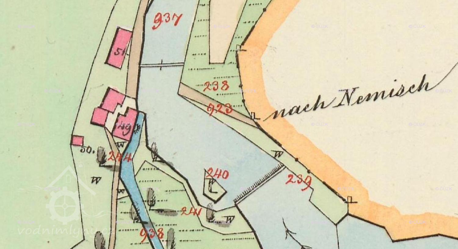 Popis1930: 1 kolo na střední vodu, hltnost 0,556 m3/s, spád 2,59 m, výkon 12,47 HP