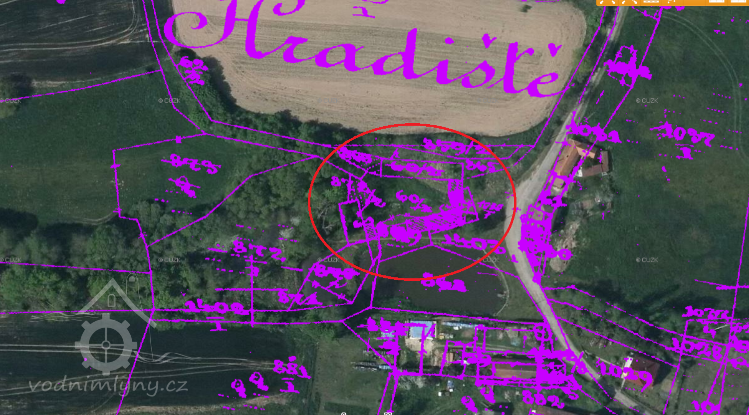 Horní rybník nad statkem, druhý (dolní) rybník na návsi vedle statku patrně k pohonu nevyužíván.