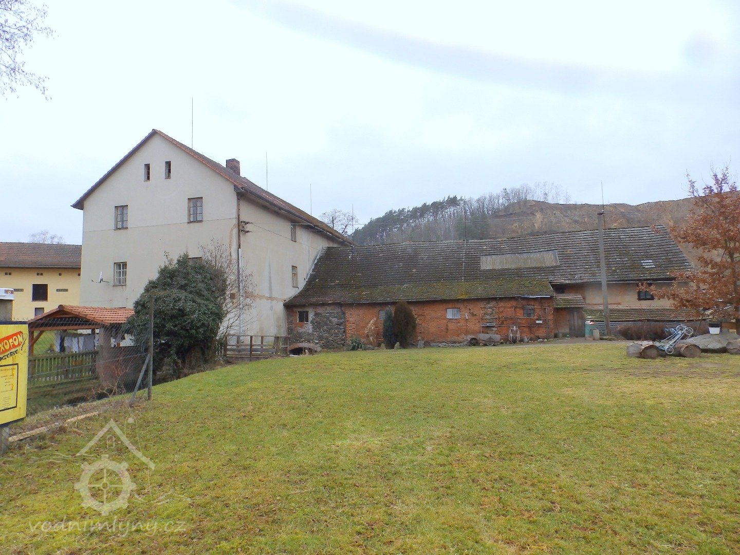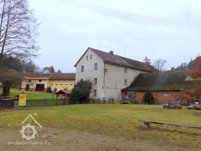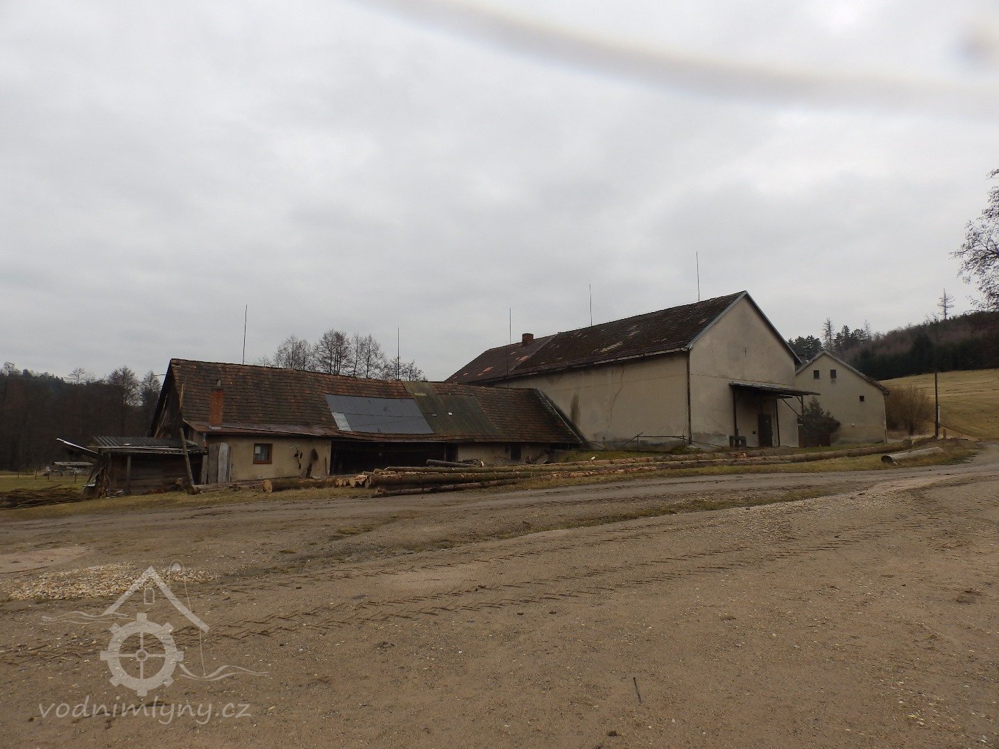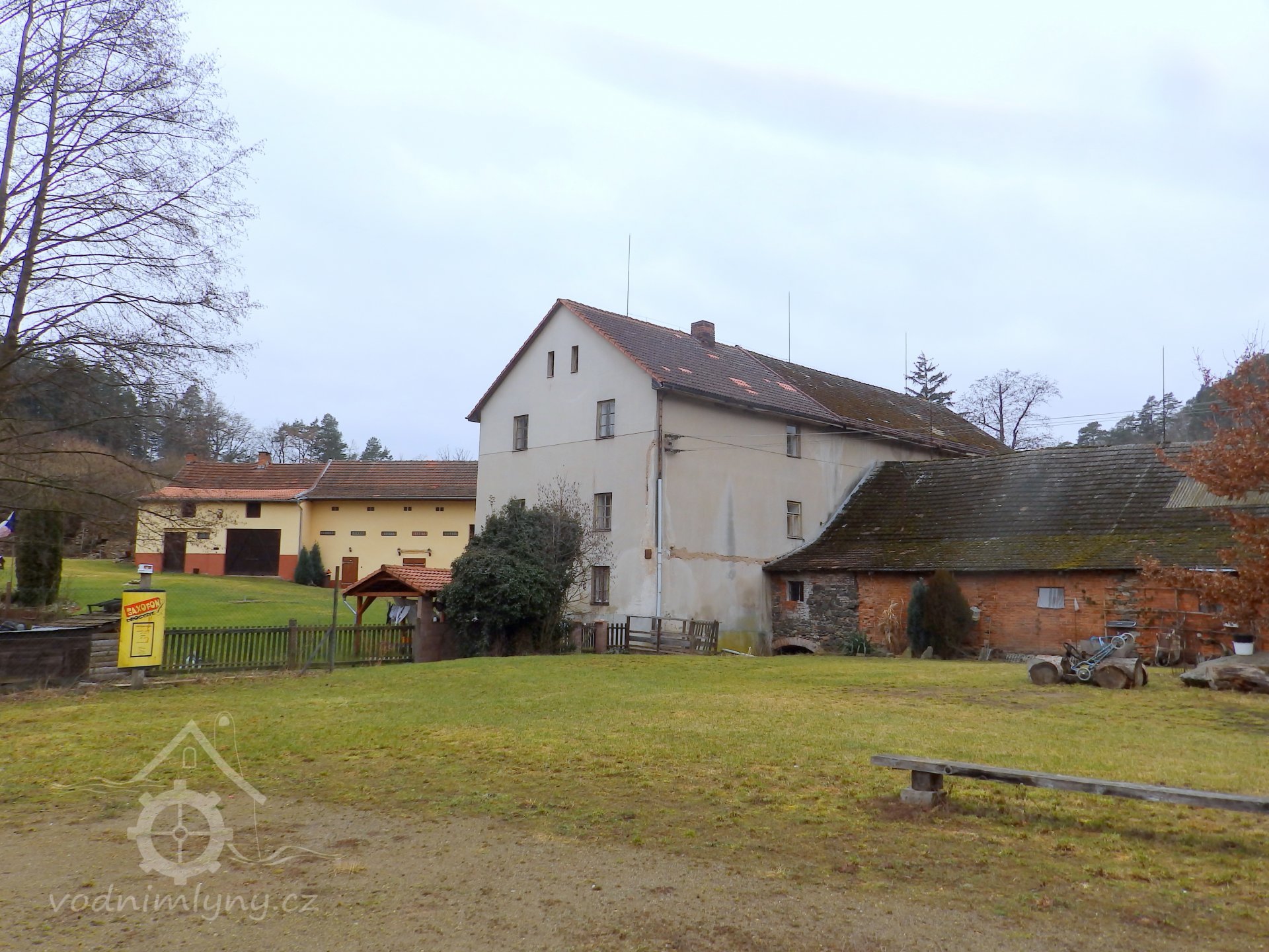 Velká budova obytné mlýnice, v pravém úhlu navazuje přízemní pila a na protější straně hospodářský trakt.