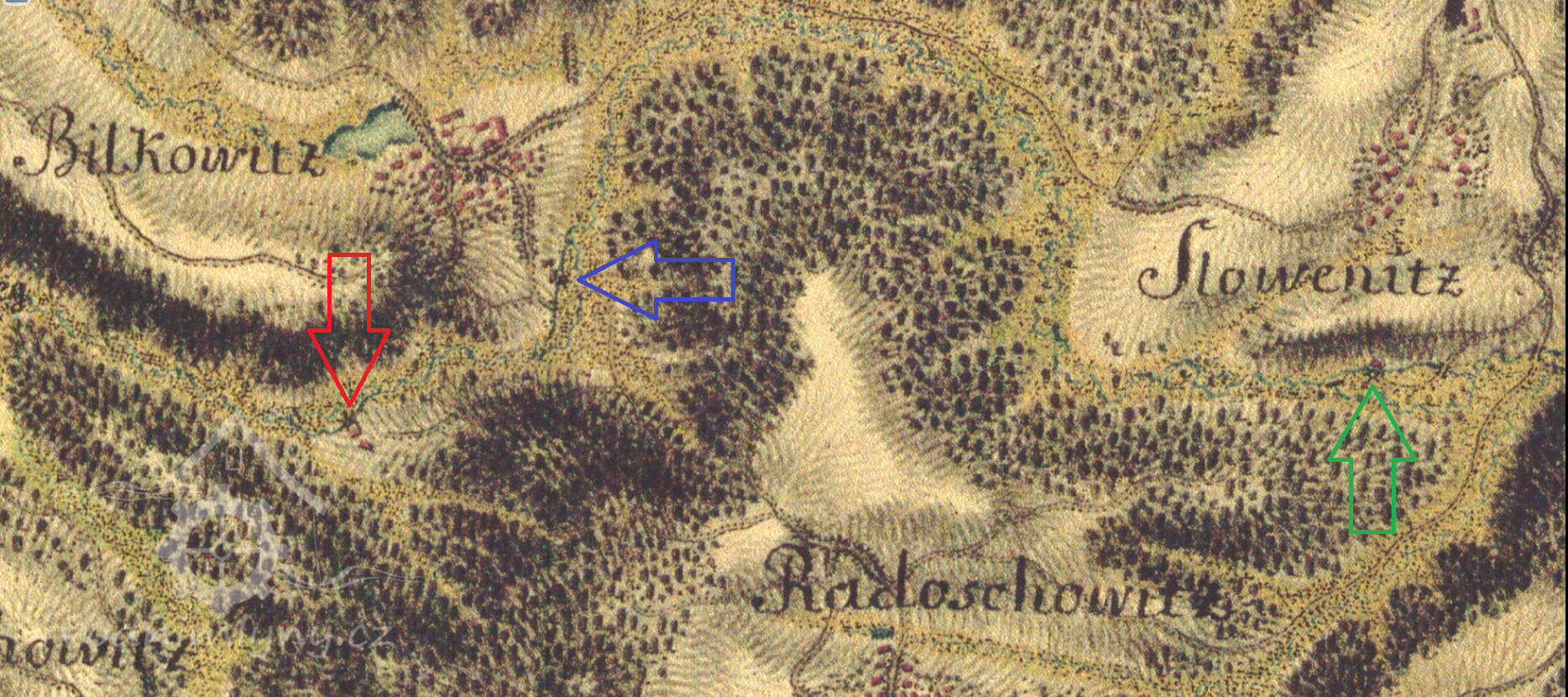2,3 km sz od kostela sv. Víta v Radošovicích, 1,2 km jz od kapličky v Bílkovicích