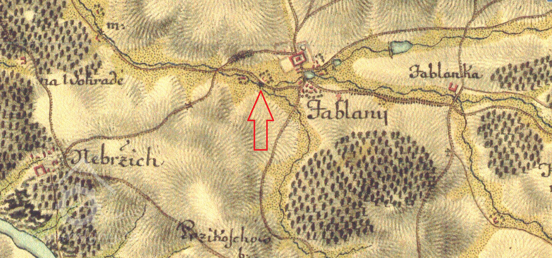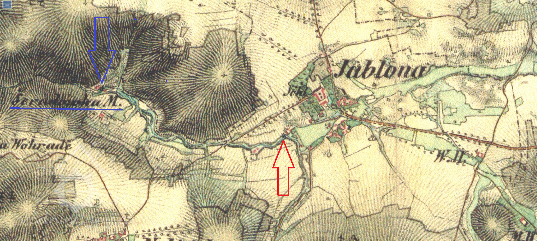 Již dávno zrušený mlýn pod rovněž již dlouho vypuštěným velkým (na leteckých záběrech však stále dobře patrným) rybníkem na jihozápadním okraji Jablonné.