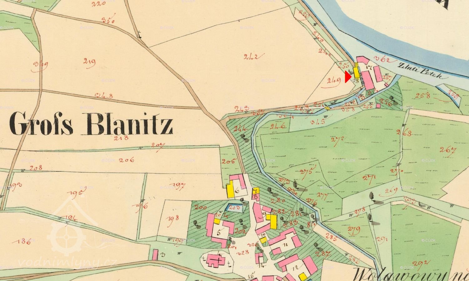 ...v květnu 1880 zasazení normálního znamení...V té době už má totiž mlýn šest vodních kol. To šesté pohání přádelnu. Kola na mlýnské stroje měla v průměru 3,26 nebo 3,48 metru, šíroká 0,79 m a nacházela se v jednom žlabu. Průměr kola na pilu byl 3,64 m a šířka 0,92 m, a přádelní o průměru 3,5 m a šířce 1,25 m... Voda z mlýnské stoky přicházela do tzv. kašny 11 m dlouhé a 2,5 m široké, hloubka vody byla 0,76 m. Z této kašny dopadala voda na kola svrchu buď výpustky (na mlýnská kola) nebo žlábky (pilní a přádelní kolo). Mlýnská stoka byla poměrně dost dlouhá. Začínala už 1371 m před mlýnem a 70 m za mlýnem se znovu vlévala do Blanice...