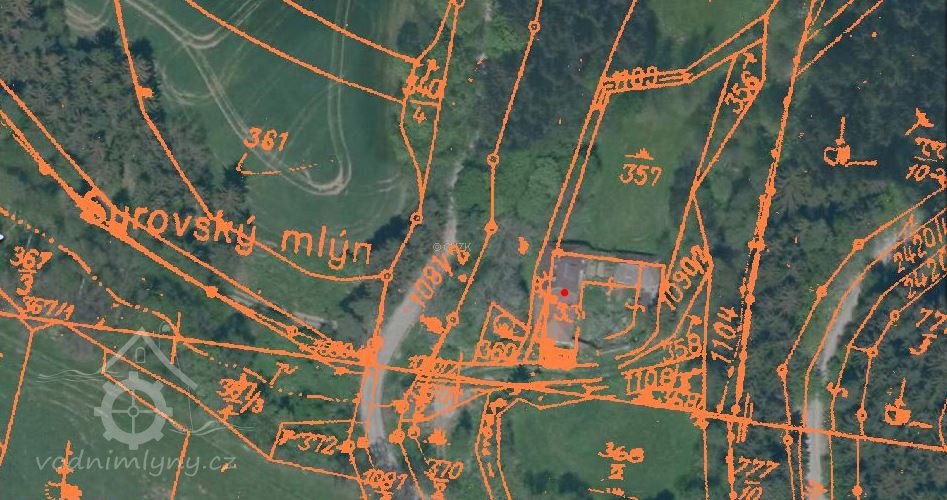 PopisV roce 1930 pohání mlýn dvě kola na svrchní vodu s průtokem 0.105 a 0.088 m3/s, spádem 2.96 m o výkonu 4.8 HP.