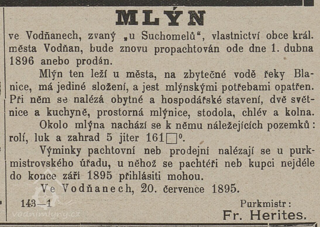 Majitelem byla od roku 1881 obec Vodňanská, město pronajalo mlýn Václavu Čejkovi, mlynáři pocházejícímu ze Štěchovic na Strakonicku.